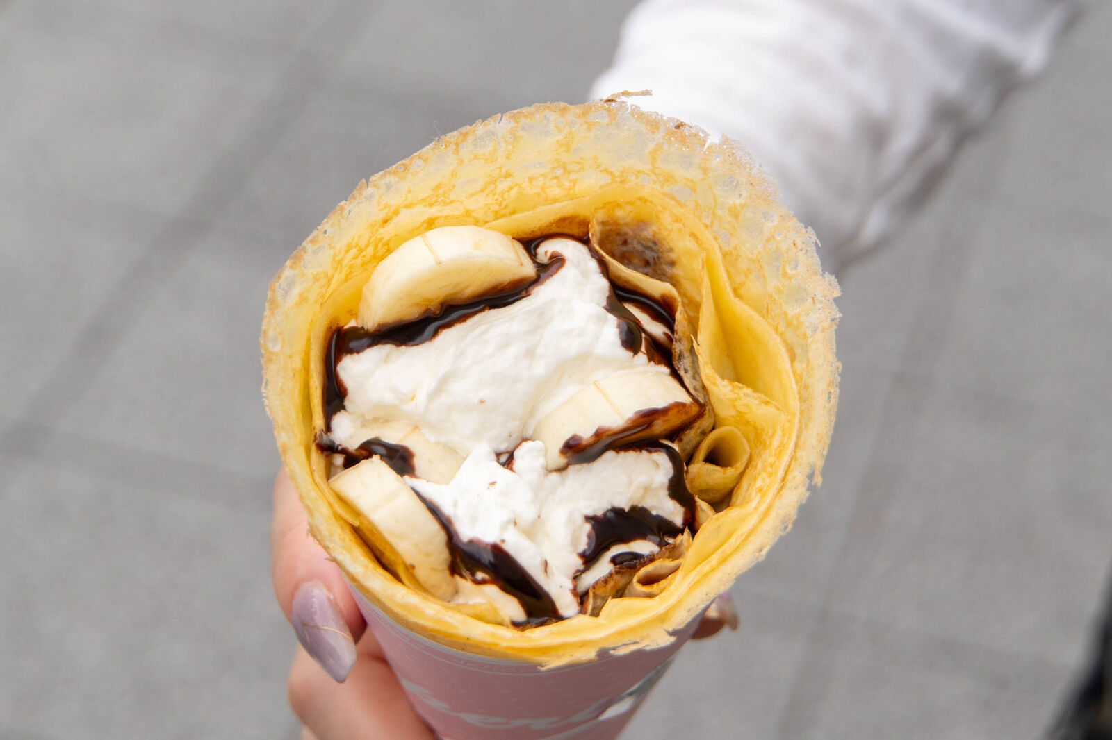 取材時には期間限定でイチゴはあったんですが、記事公開時点で終了の可能性が高く、レギュラーメニューの「生クリームバナナチョコ」にしました!