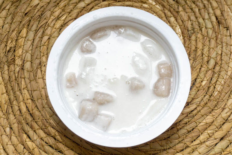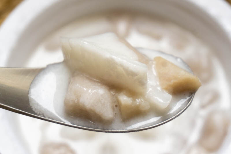 トロっとしたココナッツのスープに、甘くてモッチモチのタロイモと、シャキッとしたココナッツの実が入っています。
