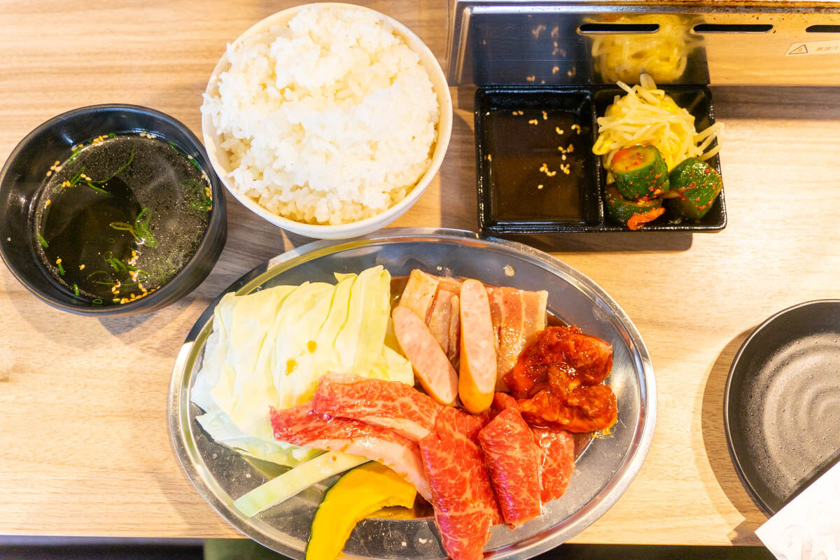 ご飯大盛り無料、スープにキムチ付き。キャベツにかぼちゃ、玉ねぎにウインナー、豚肉も鶏肉もあって、カルビやホルモンもついています。