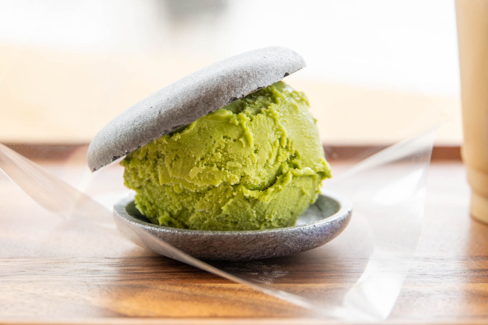 まずは最中アイスから。黒い最中って珍しいような!見た目がかっこいいです。アイスはバニラと抹茶から選ぶことができ、私リナティは抹茶に。