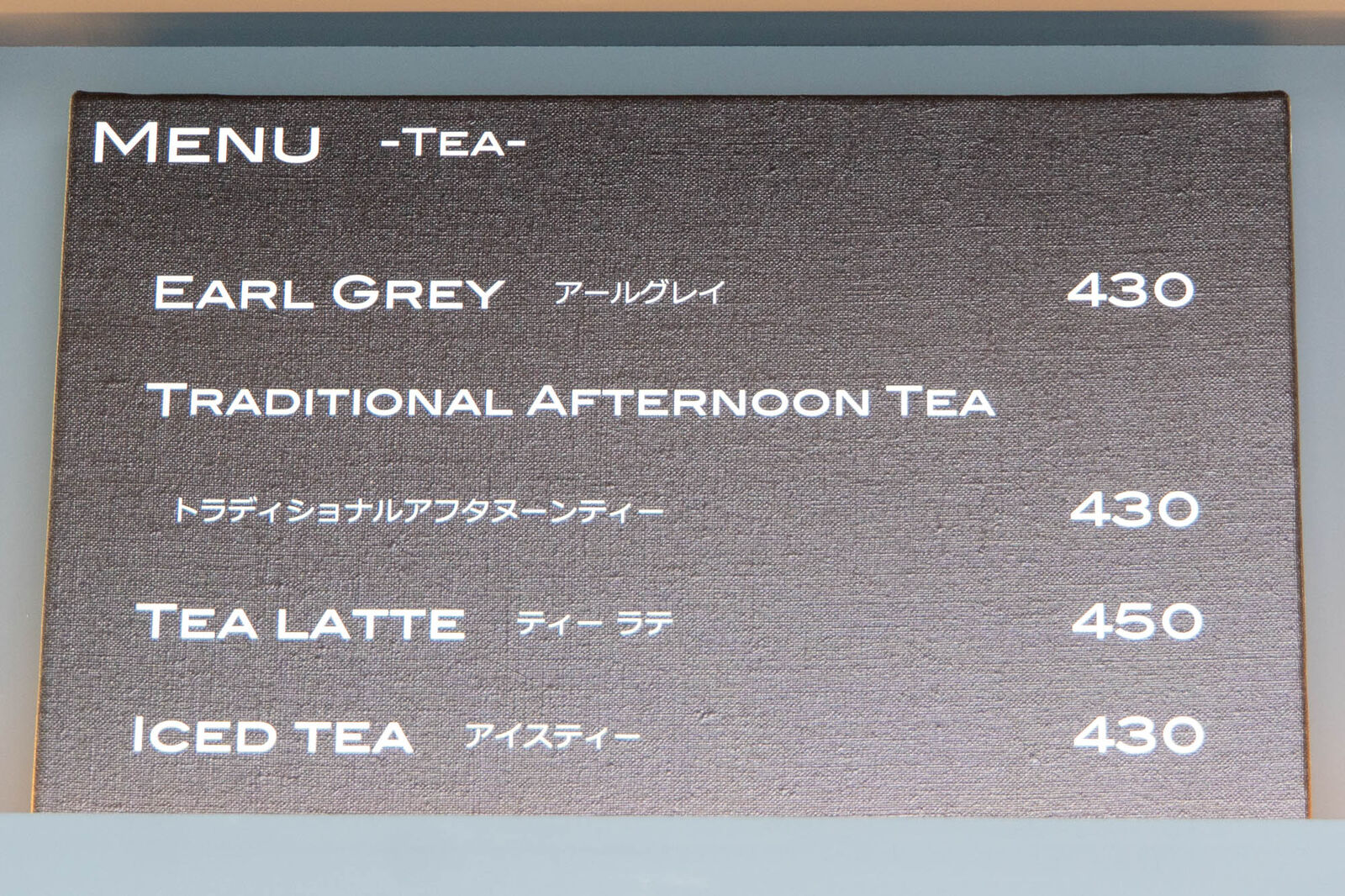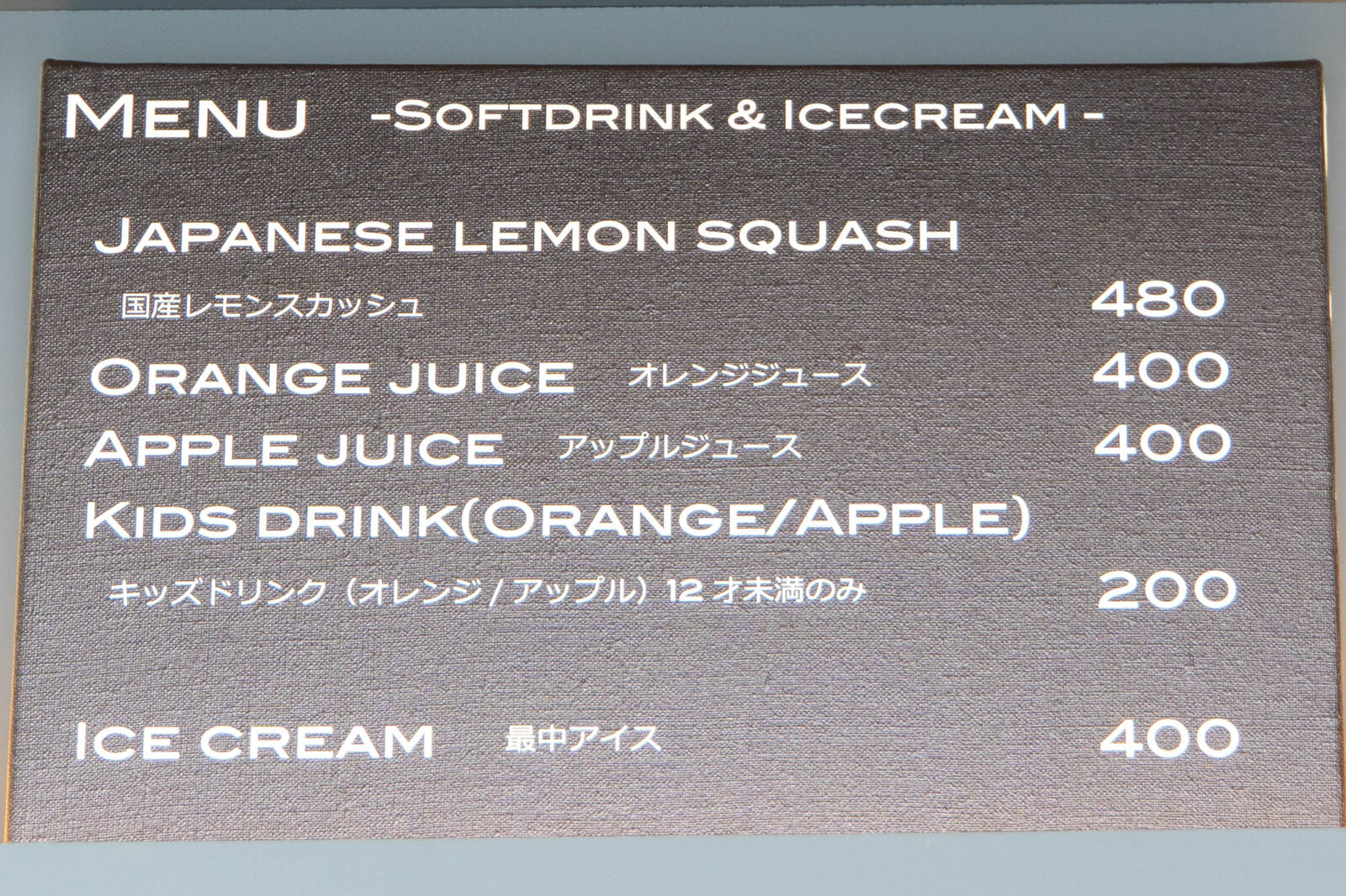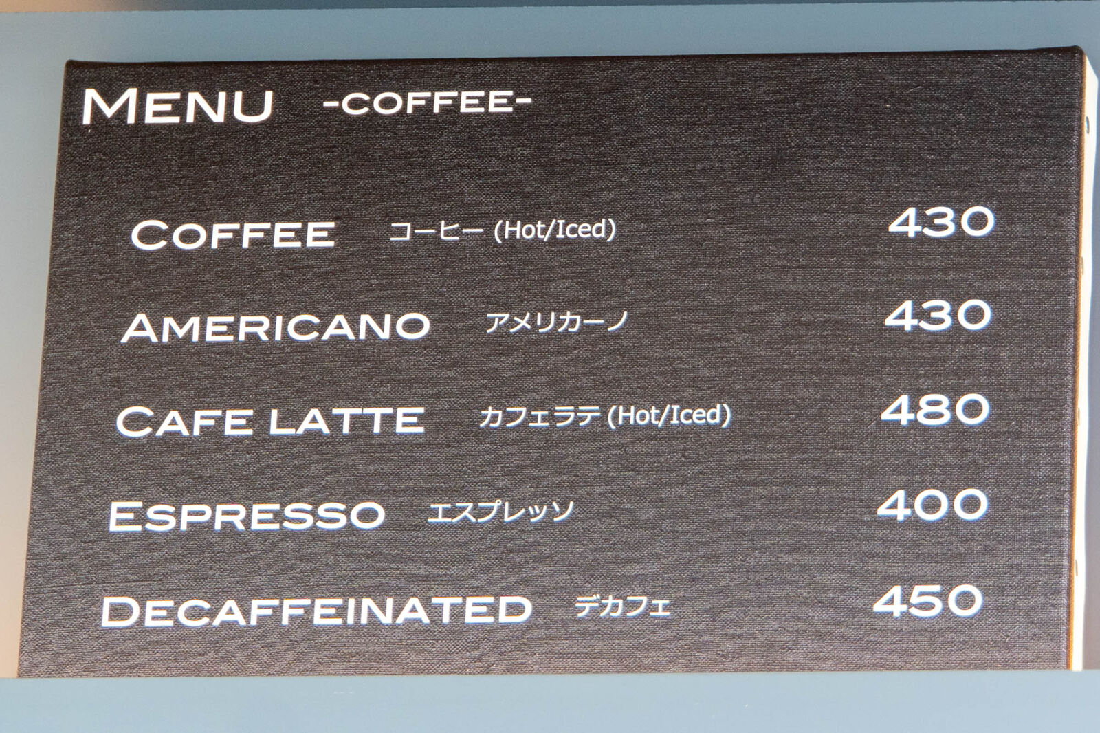メニューはドリンクがメインで、コーヒー、紅茶、ソフトドリンクがあります。