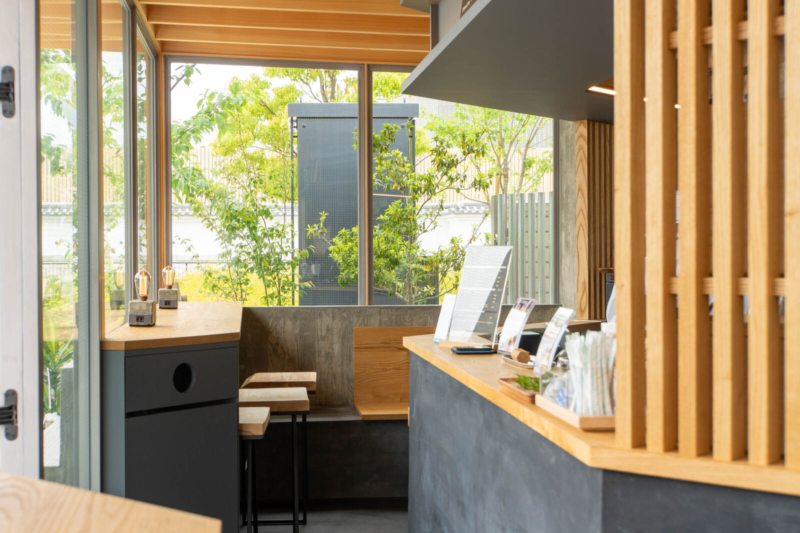 お店からは高槻城公園芸術文化劇場や野見神社を見ることができて、光が差し込む素敵な空間になっています。