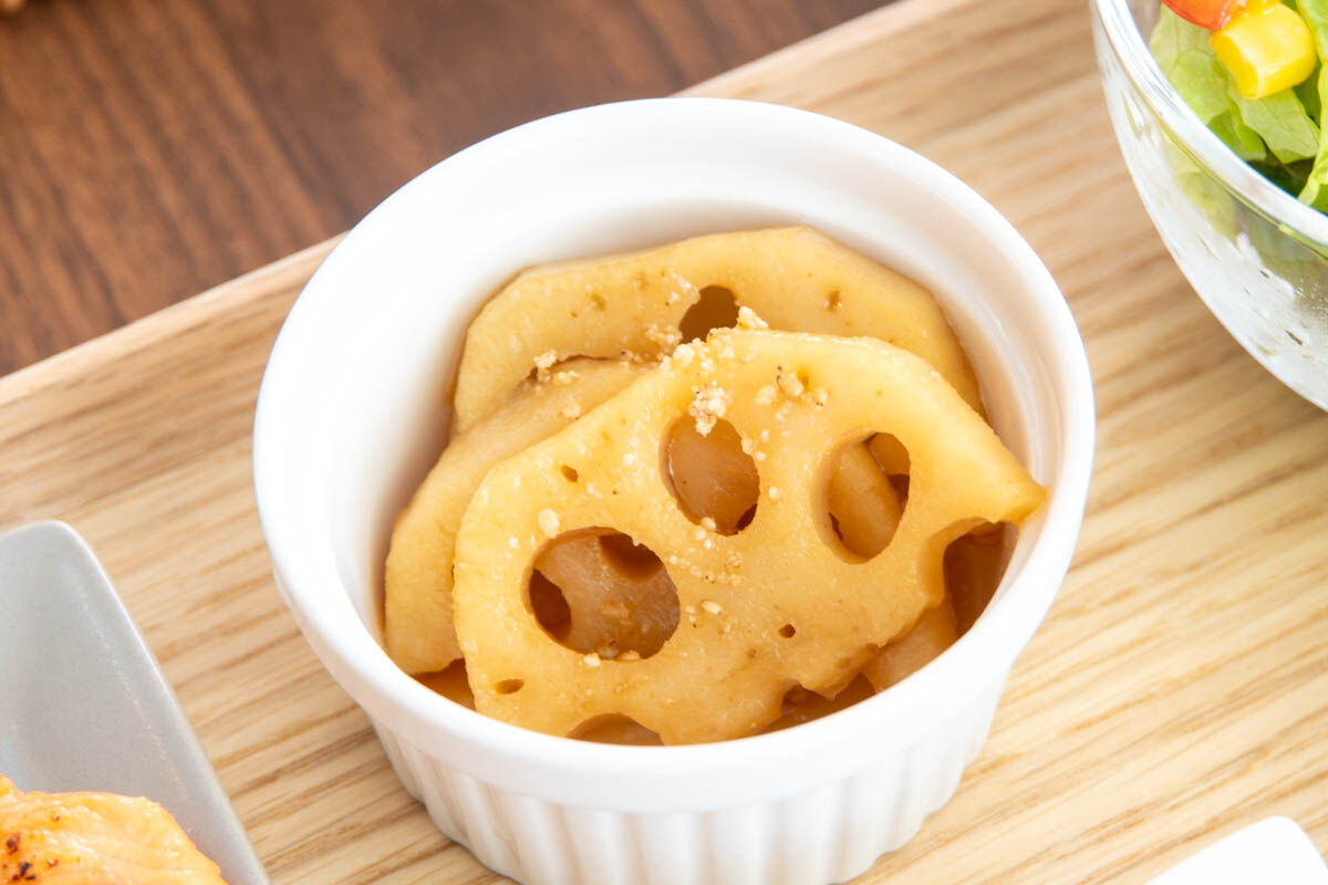 ぶ厚めにカットされた蓮根がシャキシャキしていて、甘辛い味付けが食欲をそそります!
