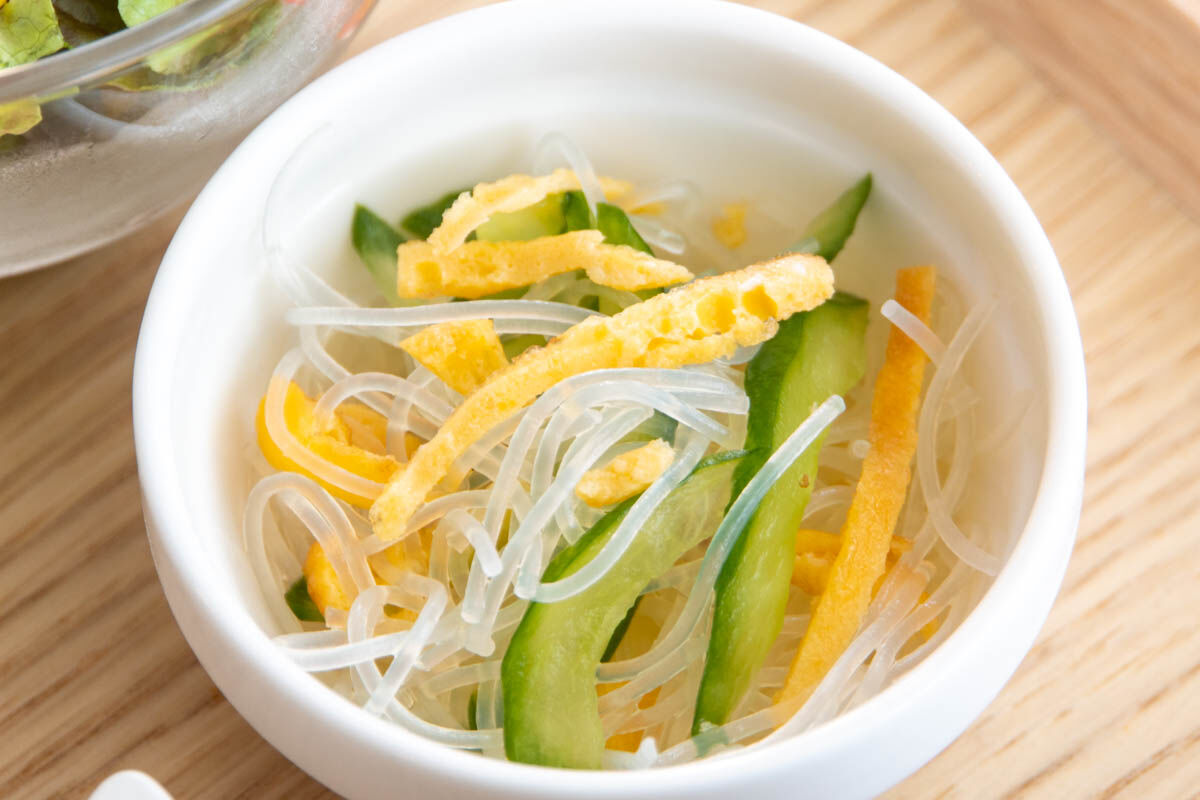 こちらは春雨と卵ときゅうりの酢の物。
