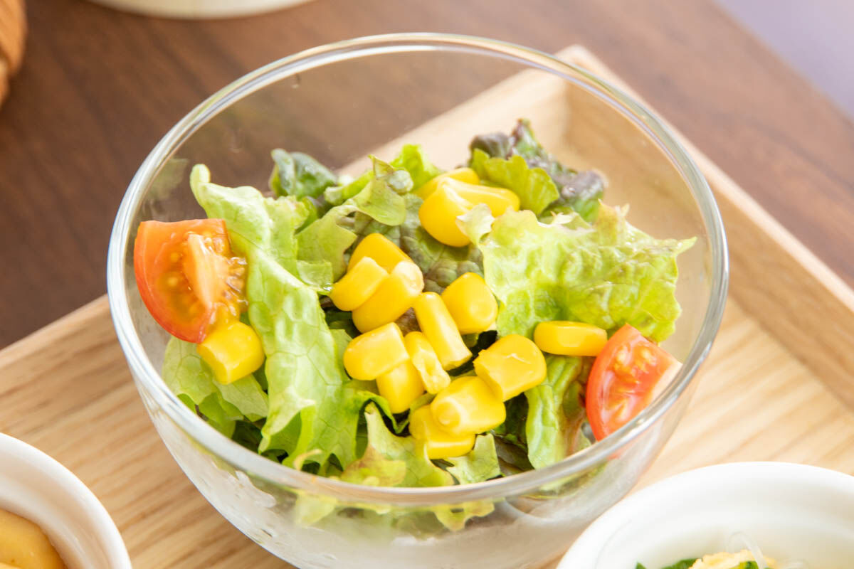 サラダはトマトにコーンにレタスと彩りが豊か。