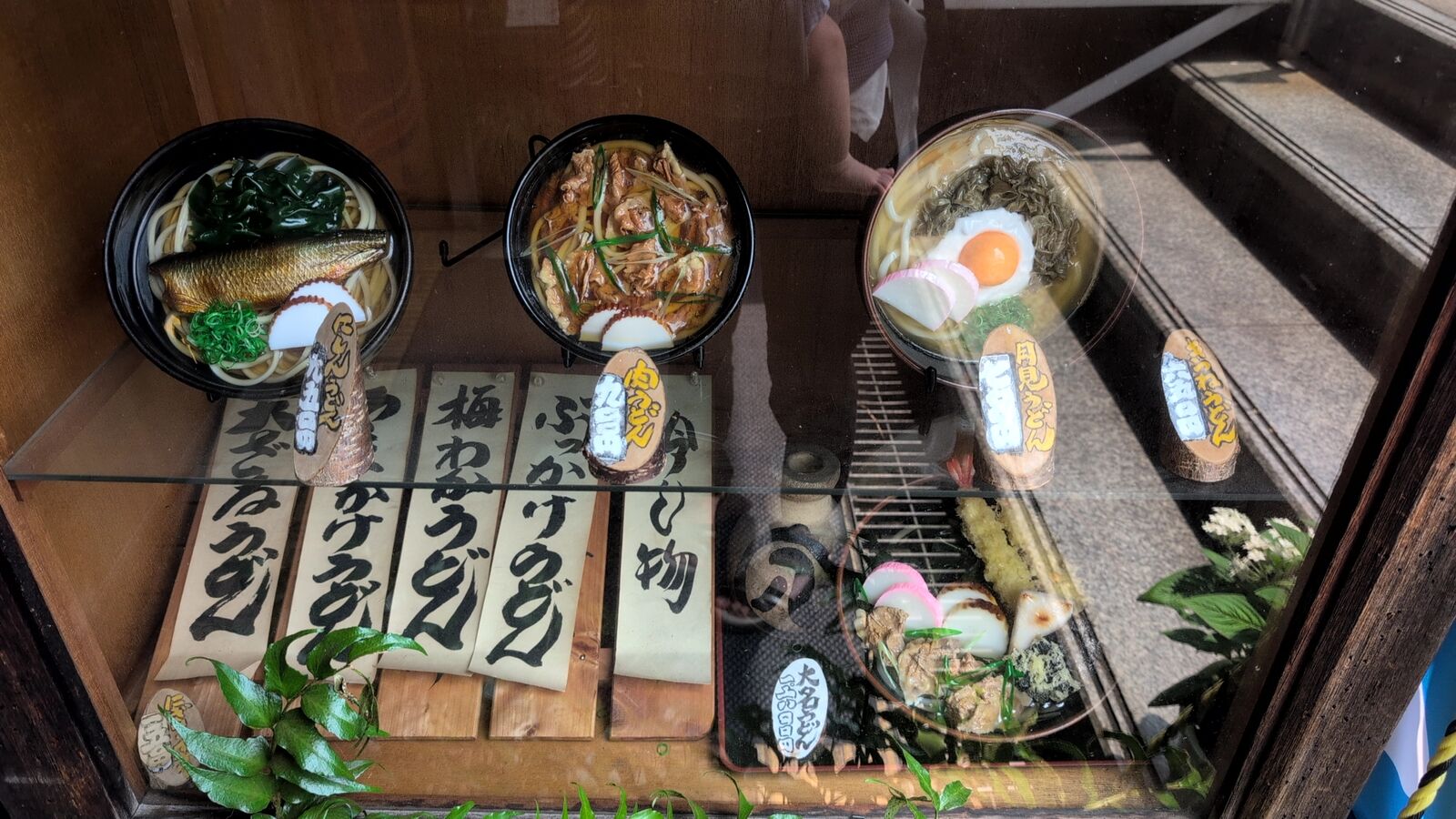 入口は昔ながらの木の扉と両脇に食品サンプルがお出迎え。