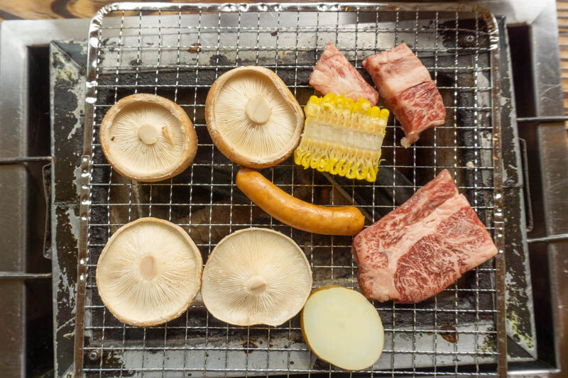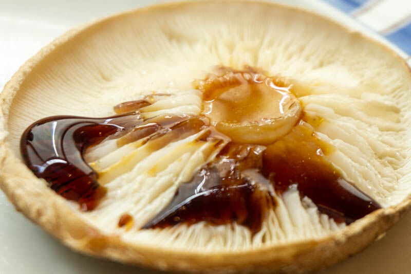 お店の方によると、しいたけの焼き方は、かさを下にして、だんだん上記写真のように水分が出てきたら食べごろなんだそうです。