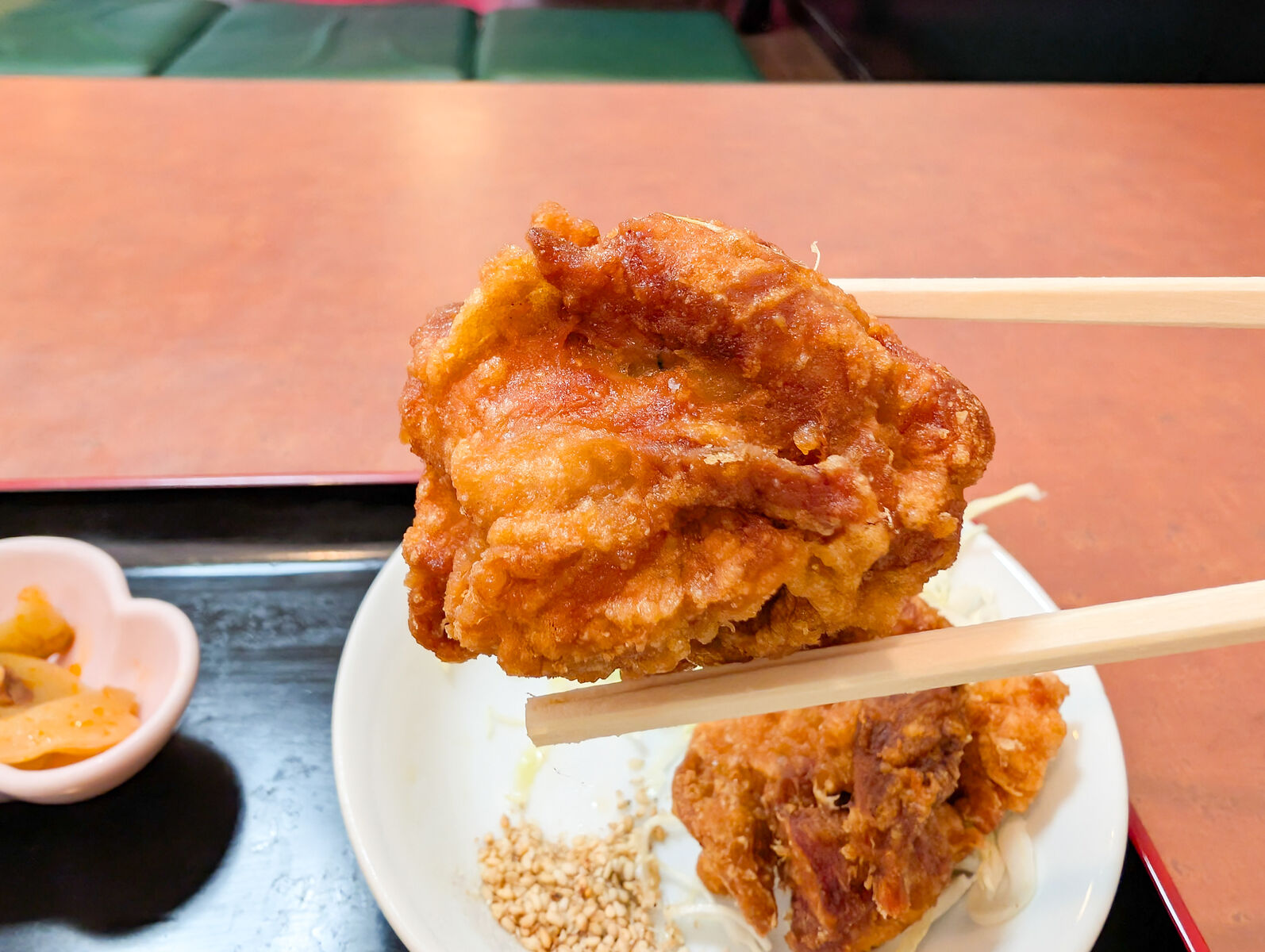 唐揚げはビッグサイズのものが2つも!添えてあるごま塩をつけて食べても美味しかったです◎