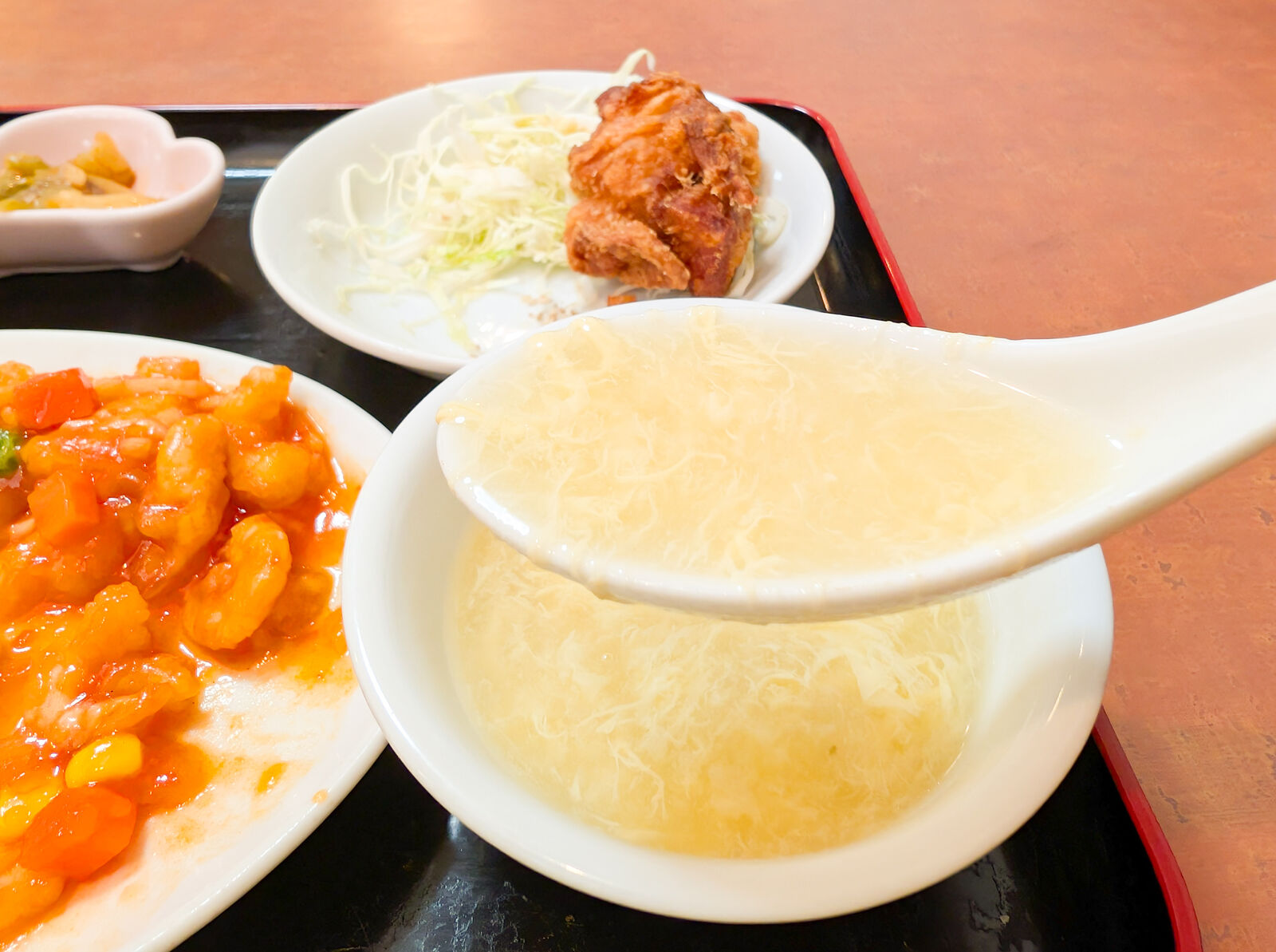 たっぷり盛られた美味しそうなエビチリに卵スープ、唐揚げ2つ、付け合わせの野菜、漬物、ご飯とボリューム大の定食!いただきます〜!