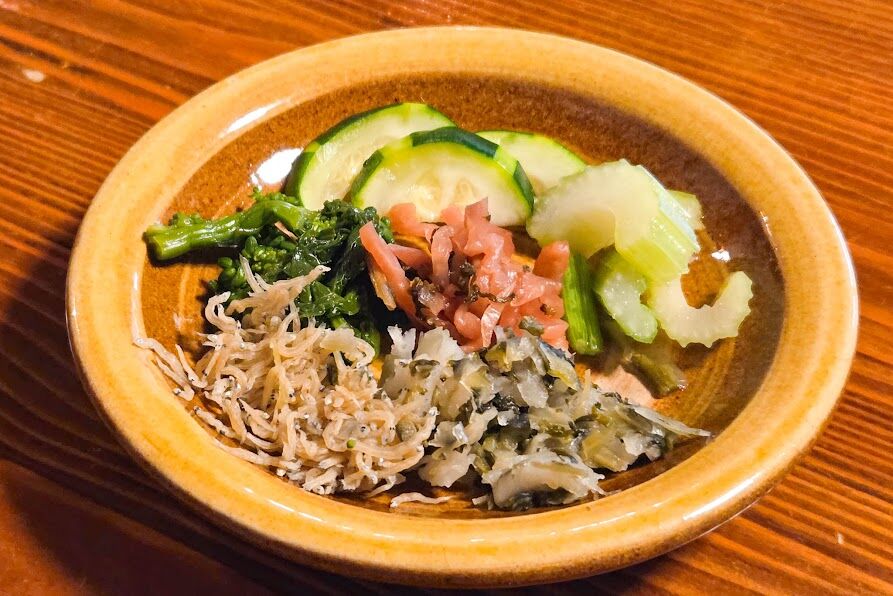 滋賀の漬物5種盛り!!なのはな、ズッキーニ、セロリ、すぐき、ちりめん山椒。さらに今回はめしどろぼという下呂のお漬物も付いていました!