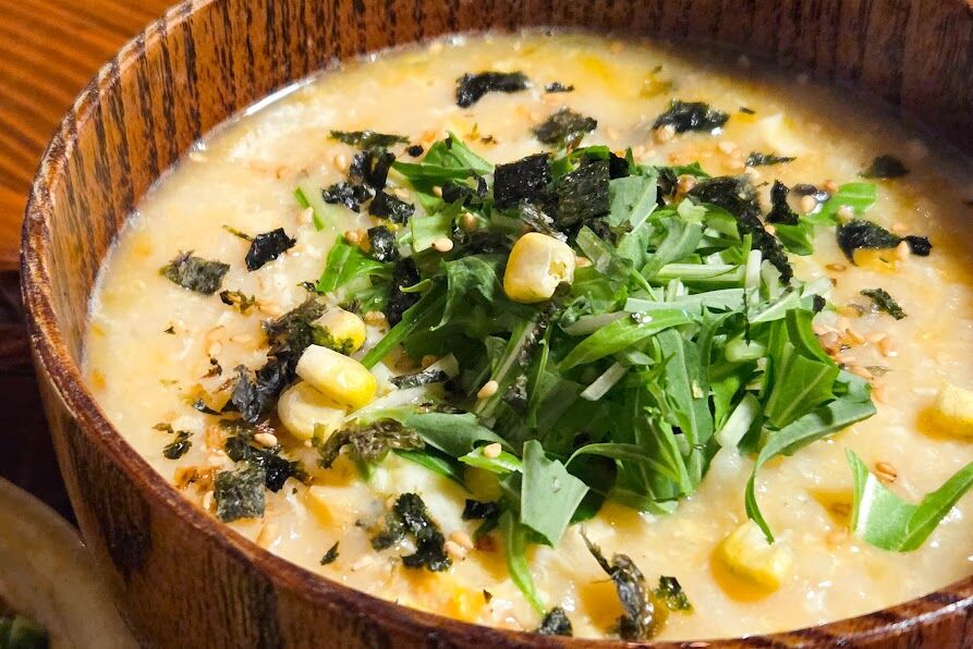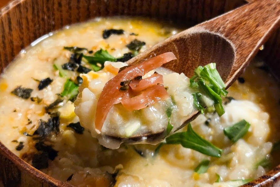 こちらが注文した雑炊。この日は貝と鳥の2種類から選べて、今回は貝にしました。和風出汁がとっても美味しくて、ほっこり身体を温めてくれます。