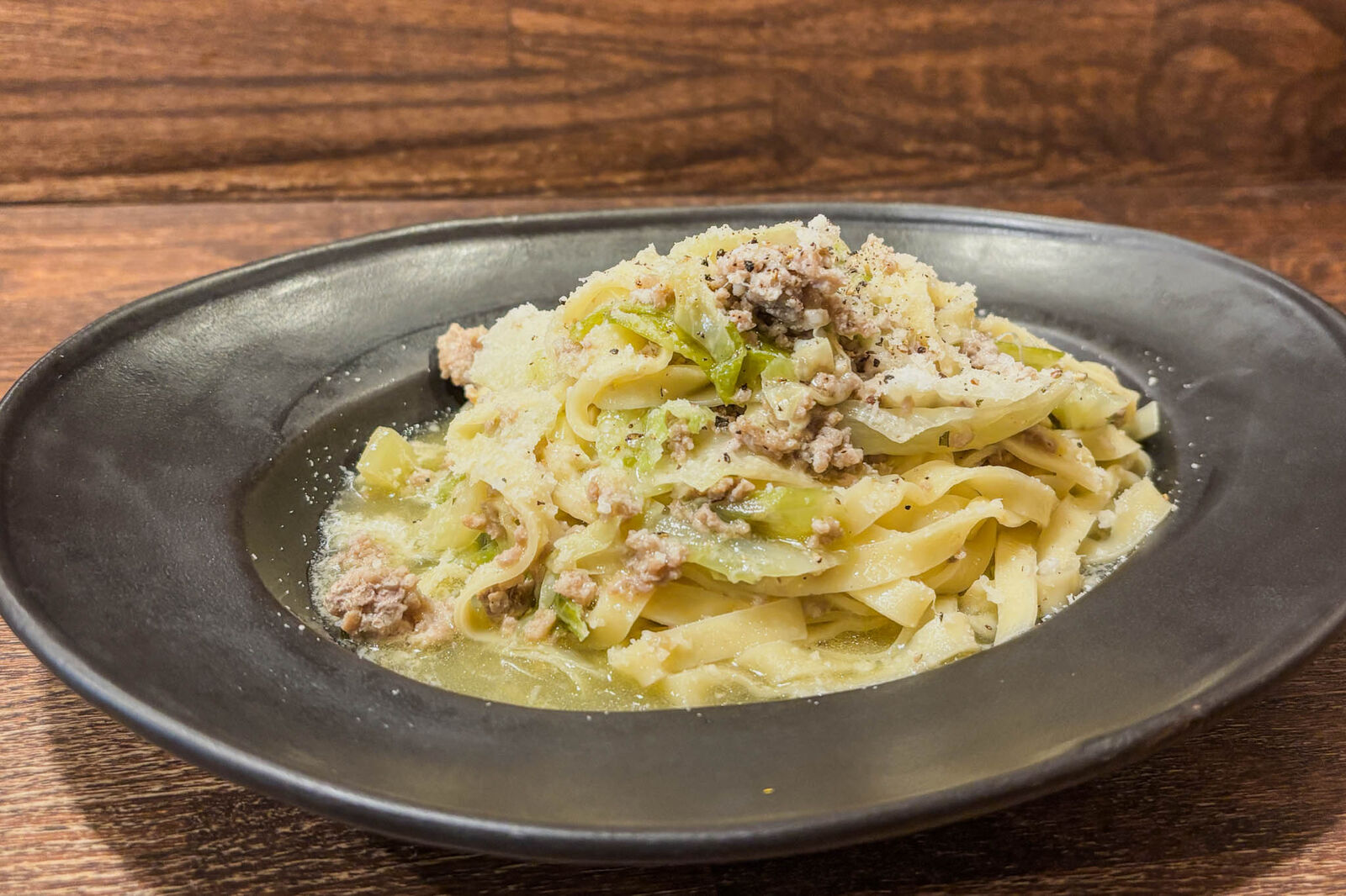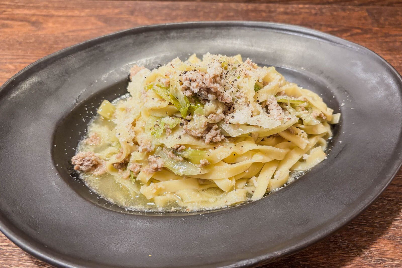 前菜を食べ終わった頃、やってきました「タリアテッレ生パスタ 豚ミンチとキャベツの煮込みオイルソース」。