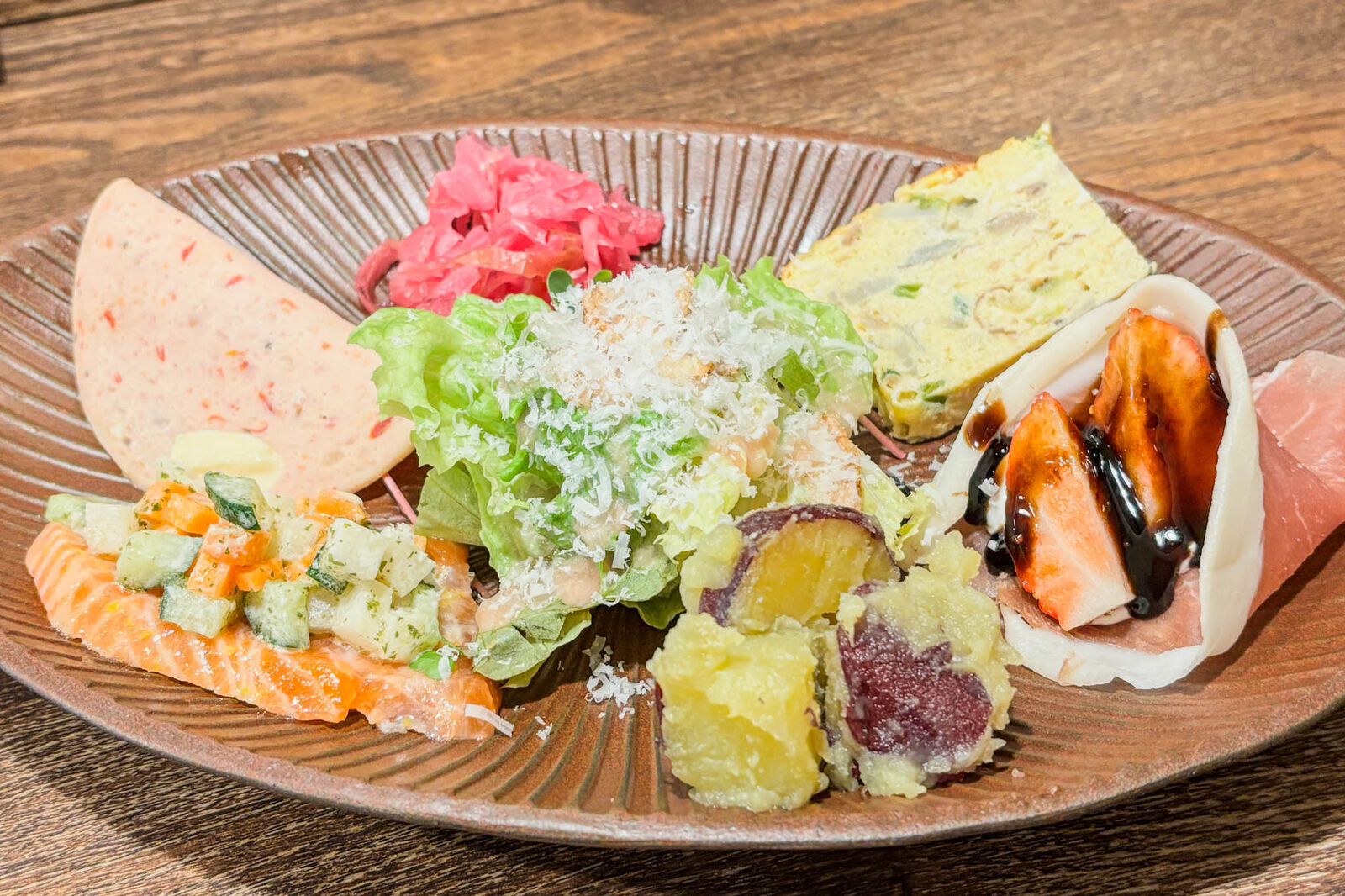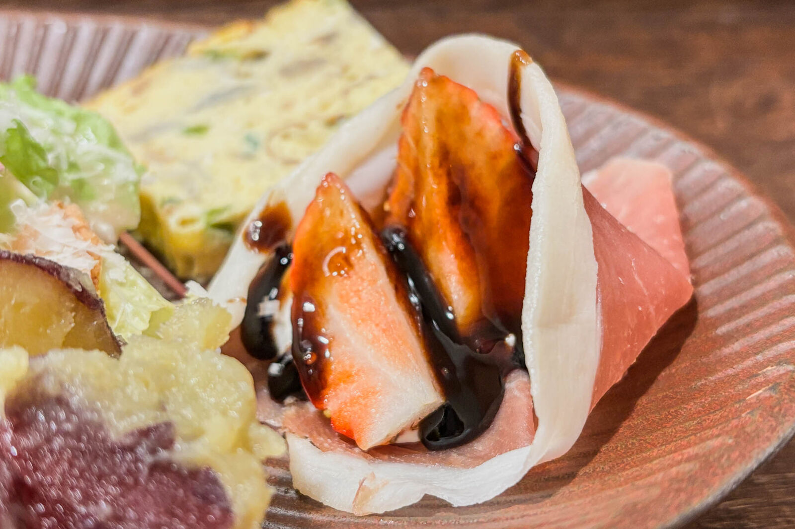 口の中で生ハム、マスカルポーネ、イチゴが絶妙にマッチする一品。
