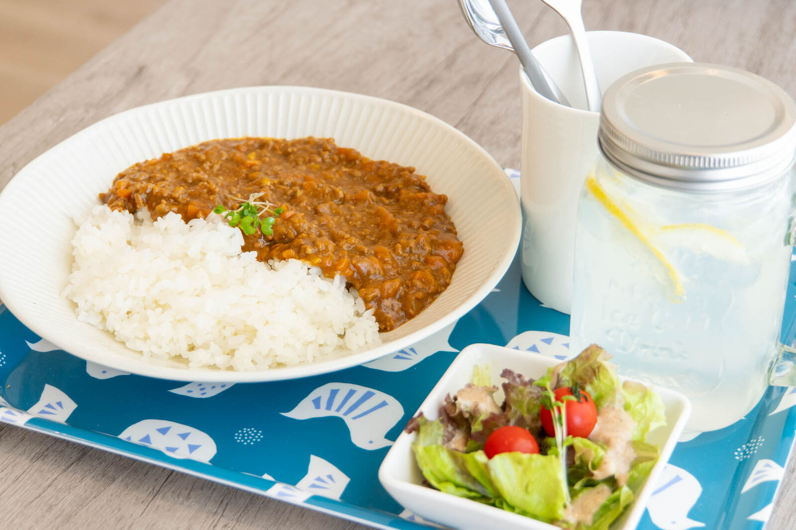 取材に行った日はちょうどランチタイムだったので、ひき肉カレーを注文!なんだかこの日は暑かったのでさっぱりしそうな生搾りレモンスカッシュも注文しました。
