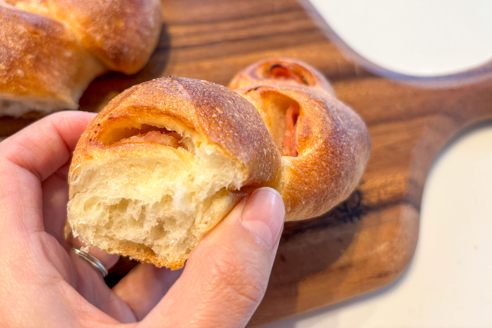 ではまずは「ベーコンエピ」をいただきます!ベーコンエピの、この連なったフォルムっていつ見てもカワイイから好きです。(笑)