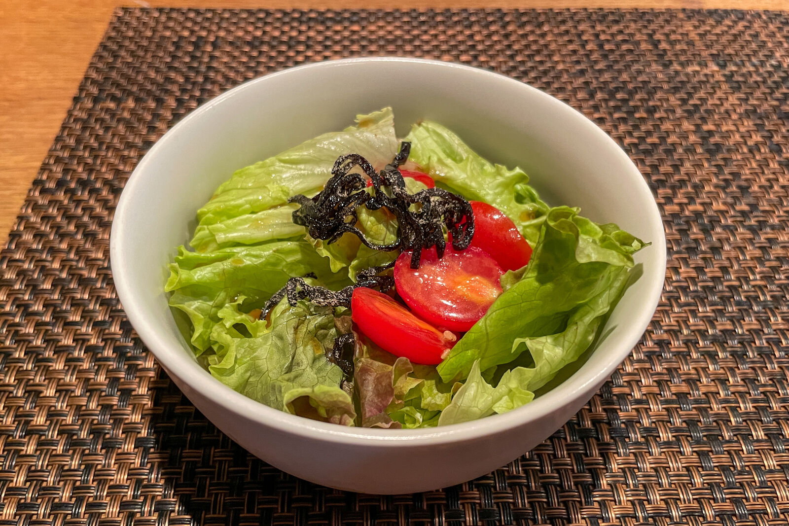 まずはサラダ。レタス・プチトマト・塩昆布のサラダはシャキシャキで美味〜!ドレッシングは和風でした。