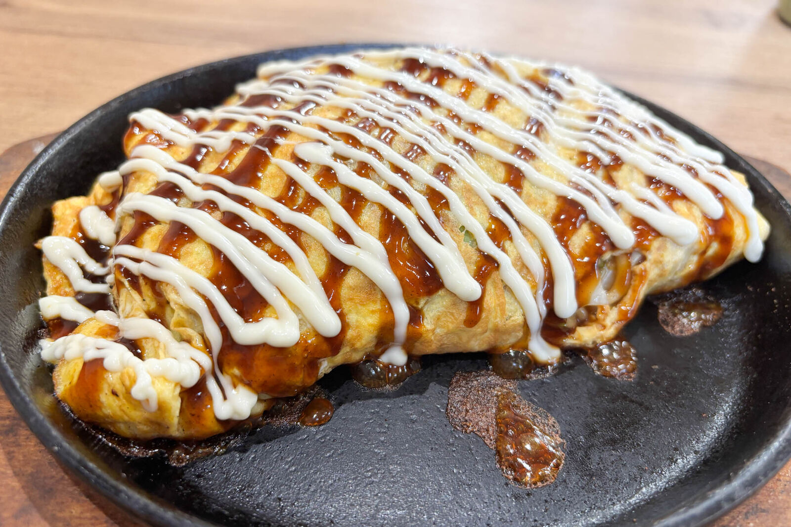 熱々の鉄板に乗って、湯気がふわっと立ち上がり食欲をそそります。