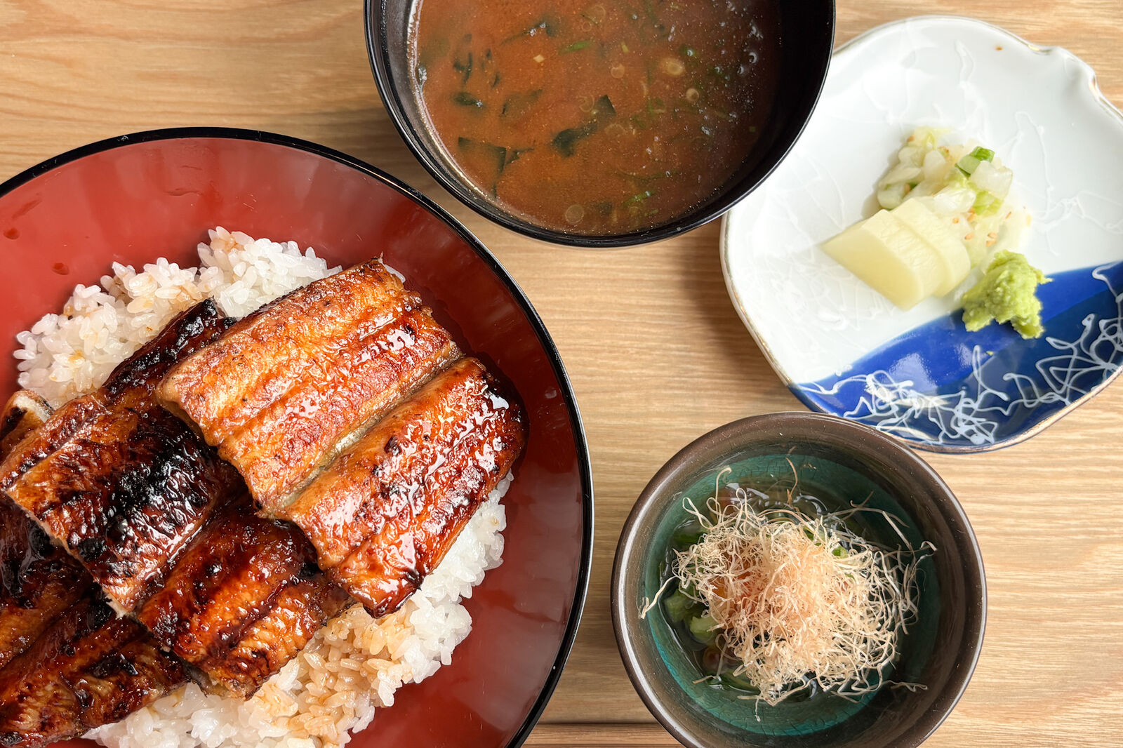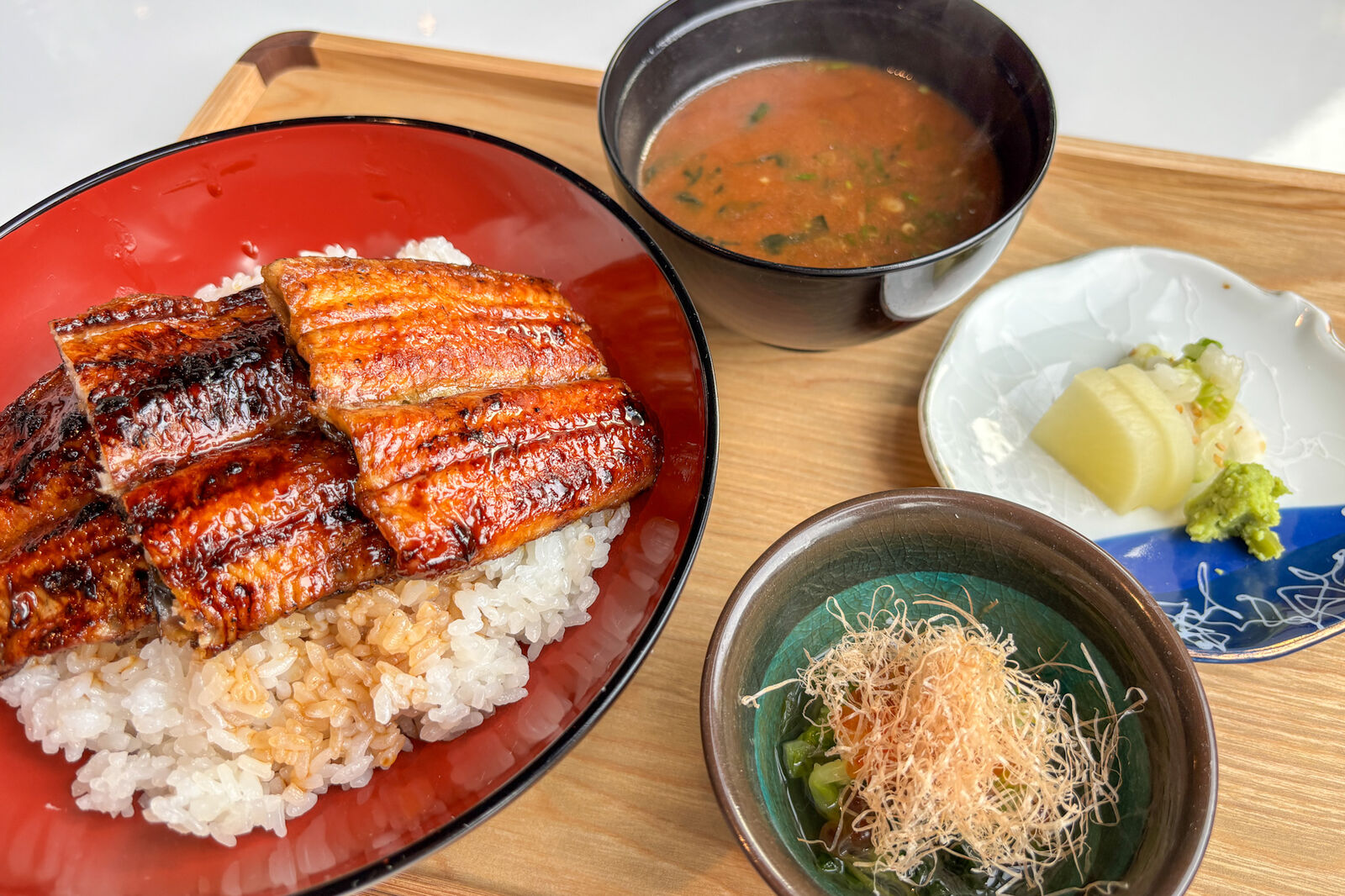 御膳にはうなぎ丼、赤だし、お漬物、小鉢がついています。