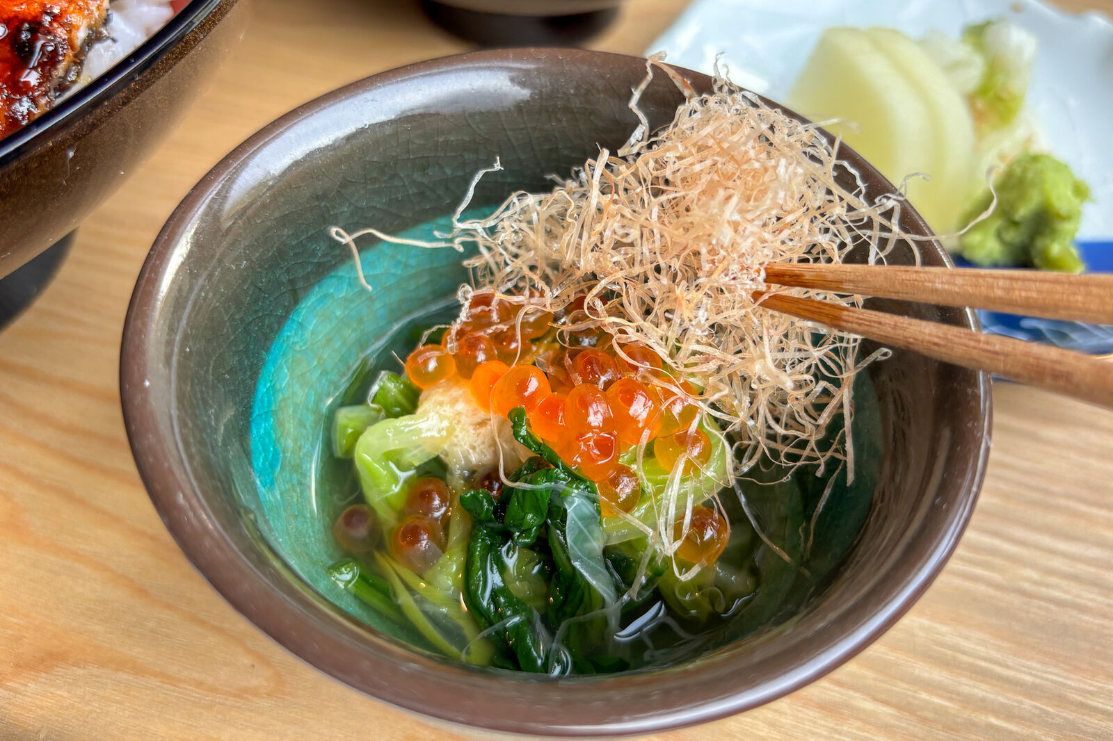 小鉢にはほうれん草、菊菜、薄揚げ、いくら、そして上には「糸がきけずり」という鰹節が。