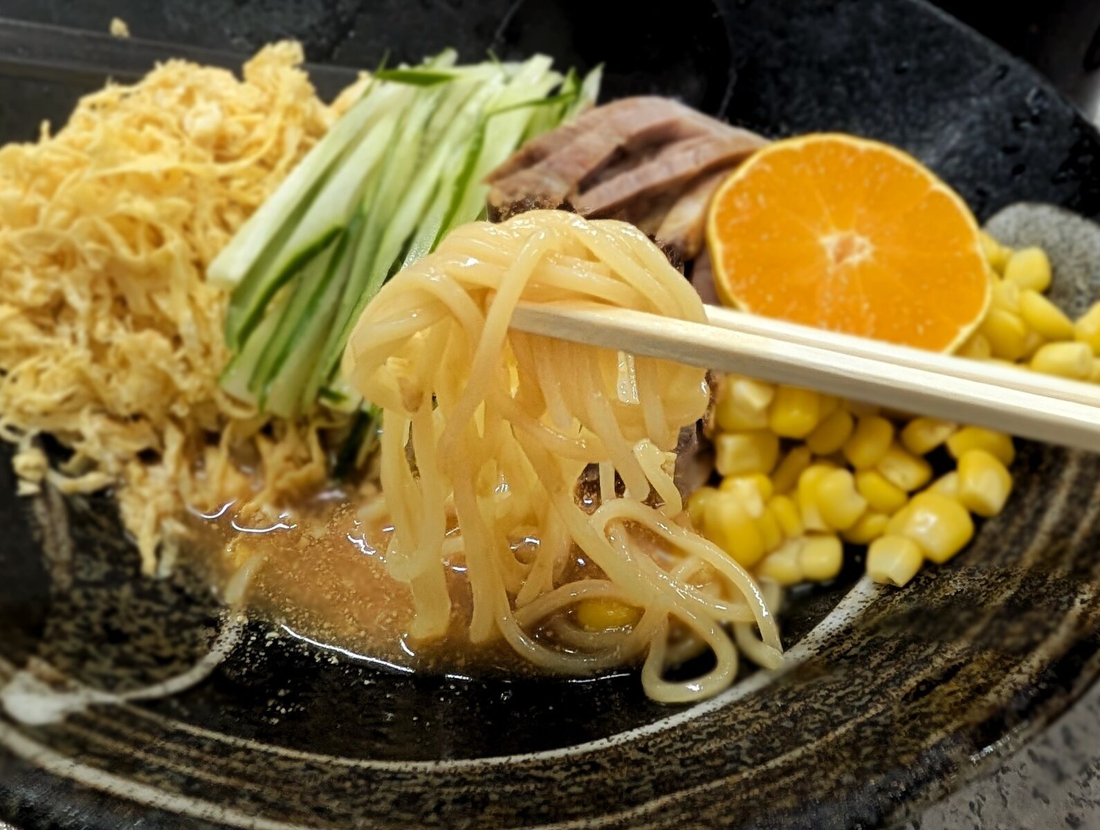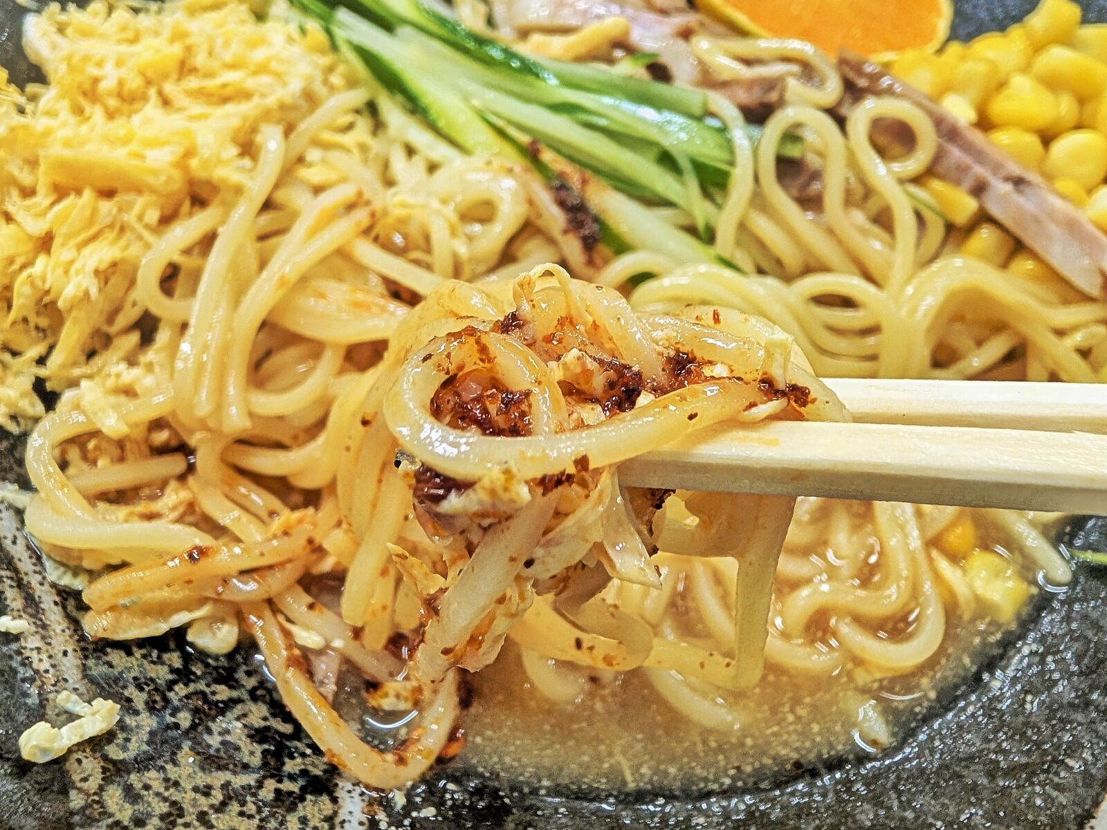 麺はもっちりで歯ごたえ良く、タレがよく絡みキラキラ光っています。