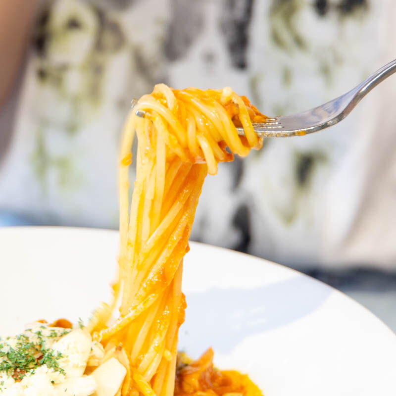 『ベーコンとナス・ホウレン草・アーモンドのトマトソーススパゲティ(1300円)』