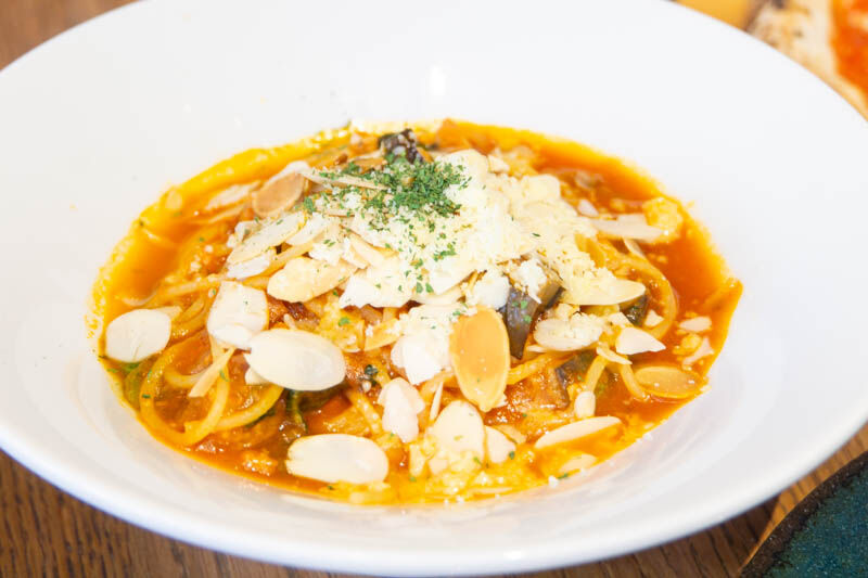 ナス・ホウレン草と野菜がいっぱい入っているのが良かった!旨味が効いたトマトソースにアーモンドが香ばしかったです!