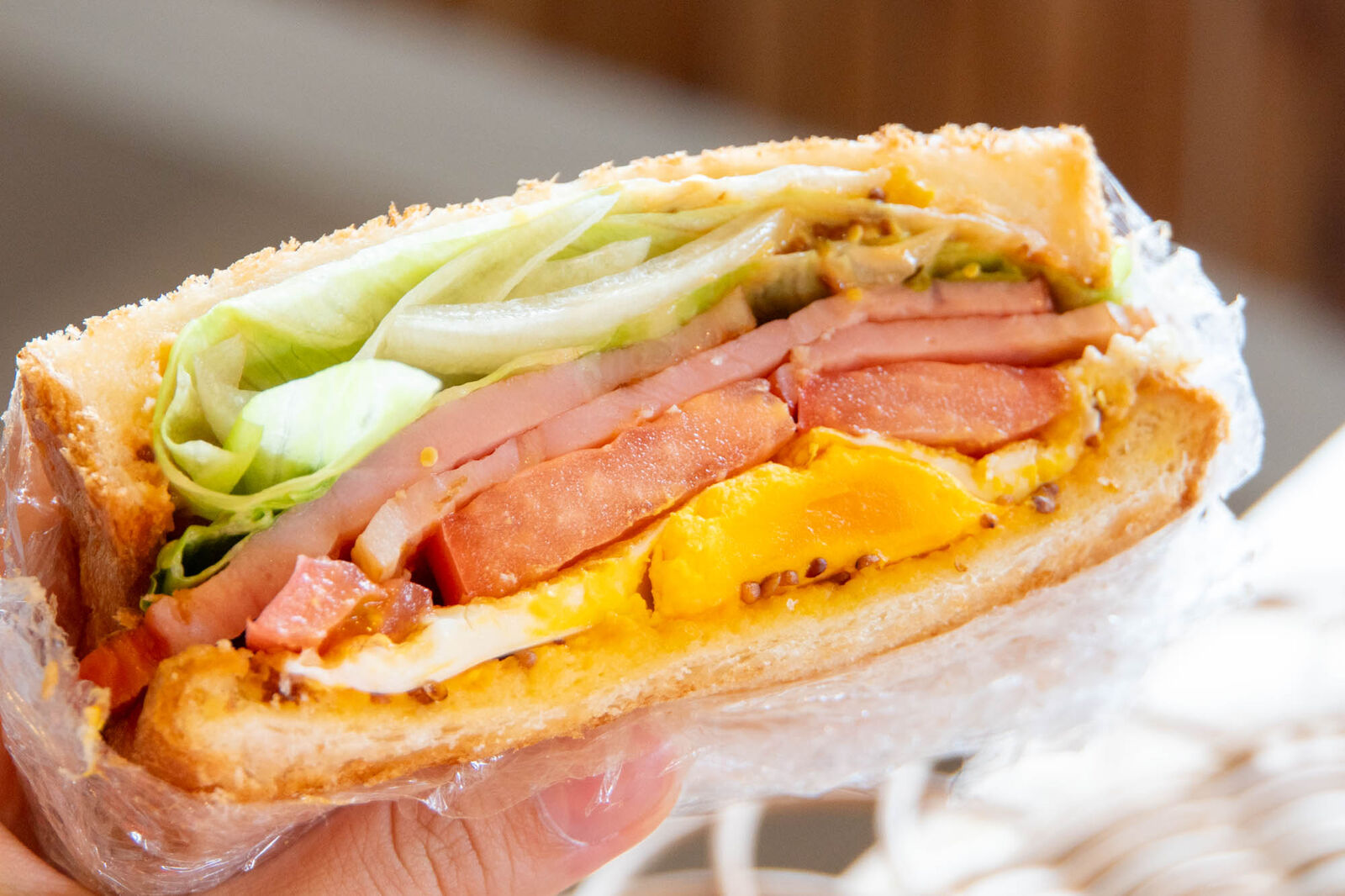 BLTTサンドはこの分厚さ!たっぷりのレタスはシャキシャキで、ハム、卵、トマトと具だくさんです〜!