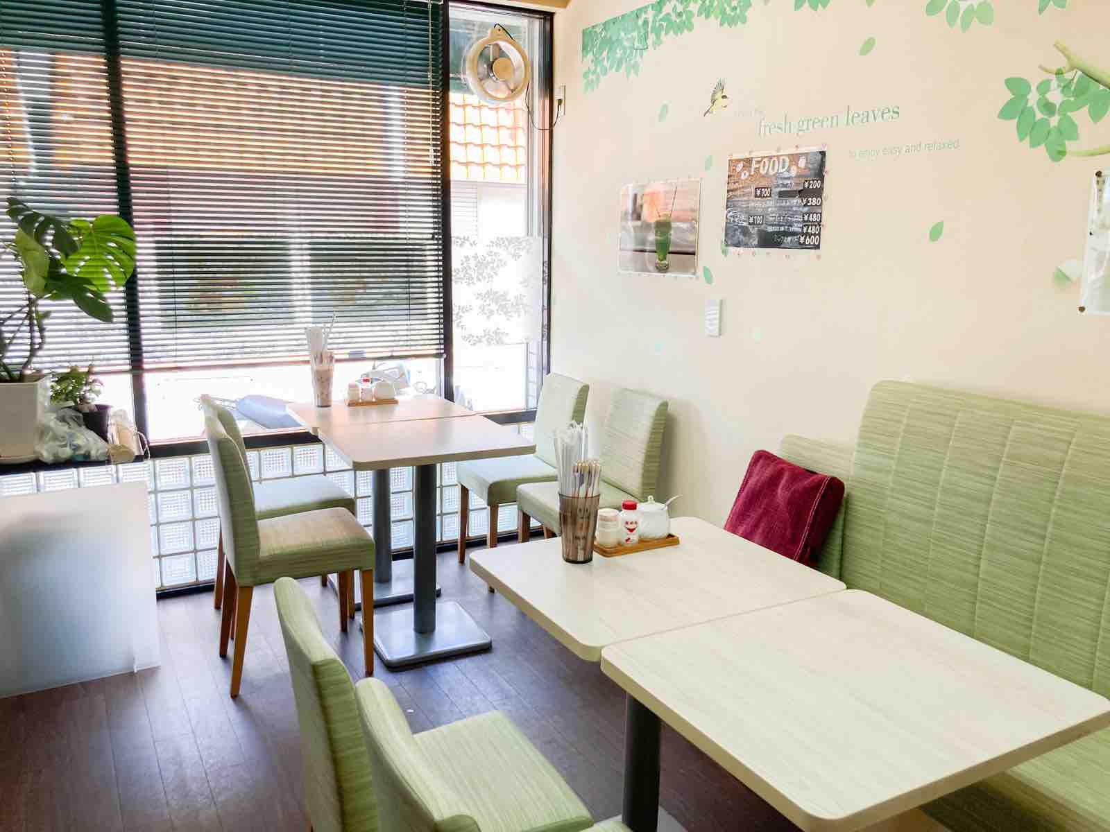 テーブル席が3卓あります。緑が基調の爽やかで落ち着く空間。