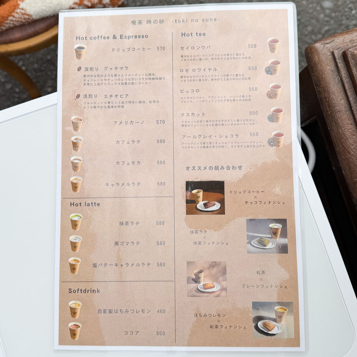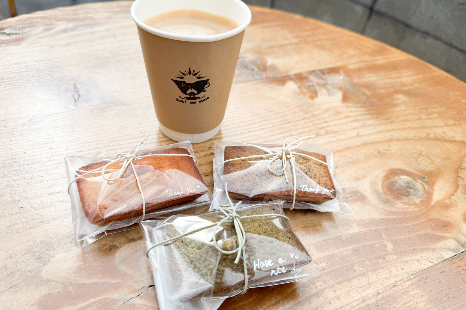 カフェオレとプレーンフィナンシェ、紅茶フィナンシェ、抹茶フィナンシェをテイクアウトし、奥のテーブルで食べることに!