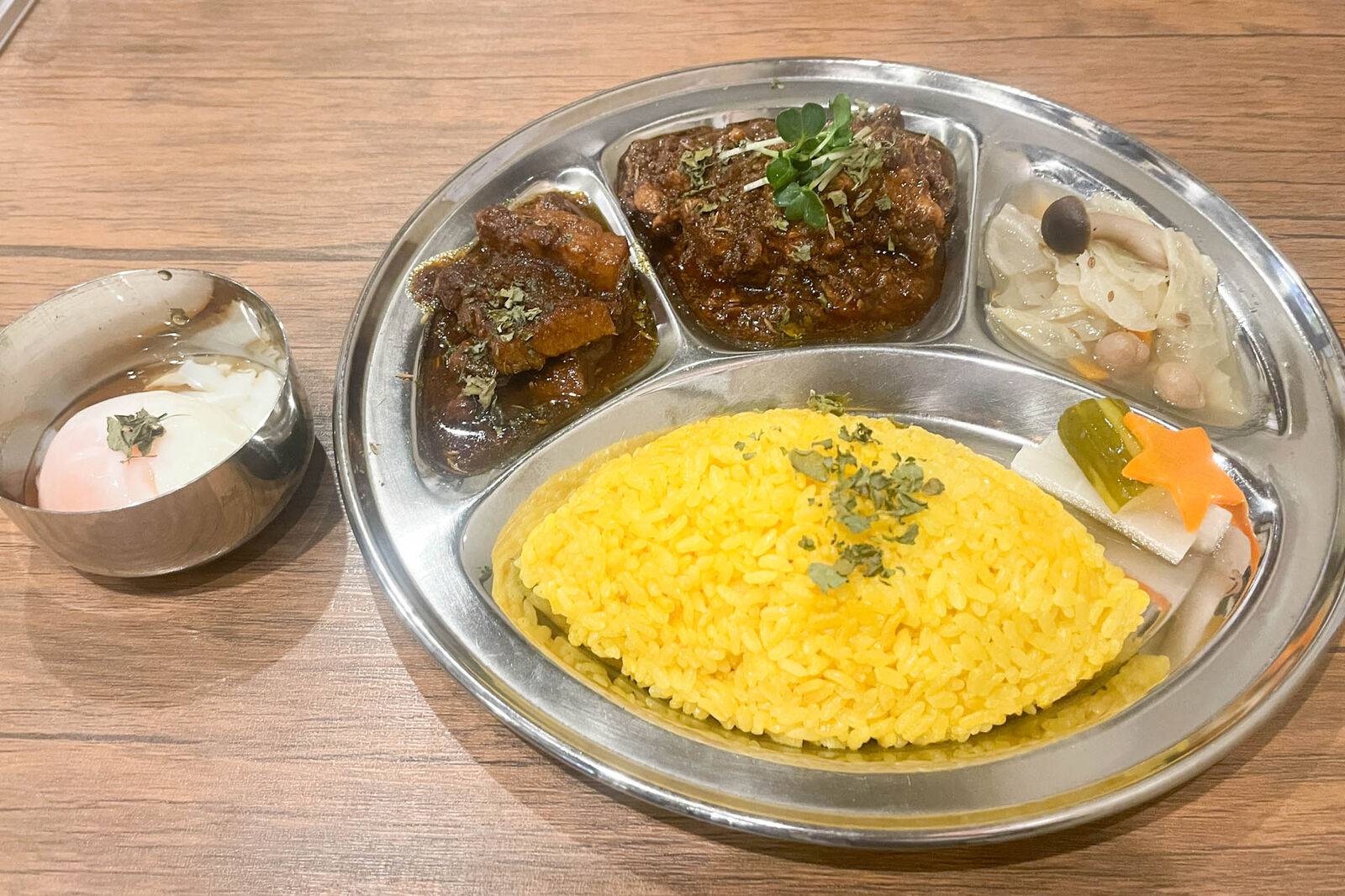 ポークマサラプレートとチキンマサプレートがありますが、今回はどちらも楽しめる「あいがけプレート」と「温泉玉子」を注文。