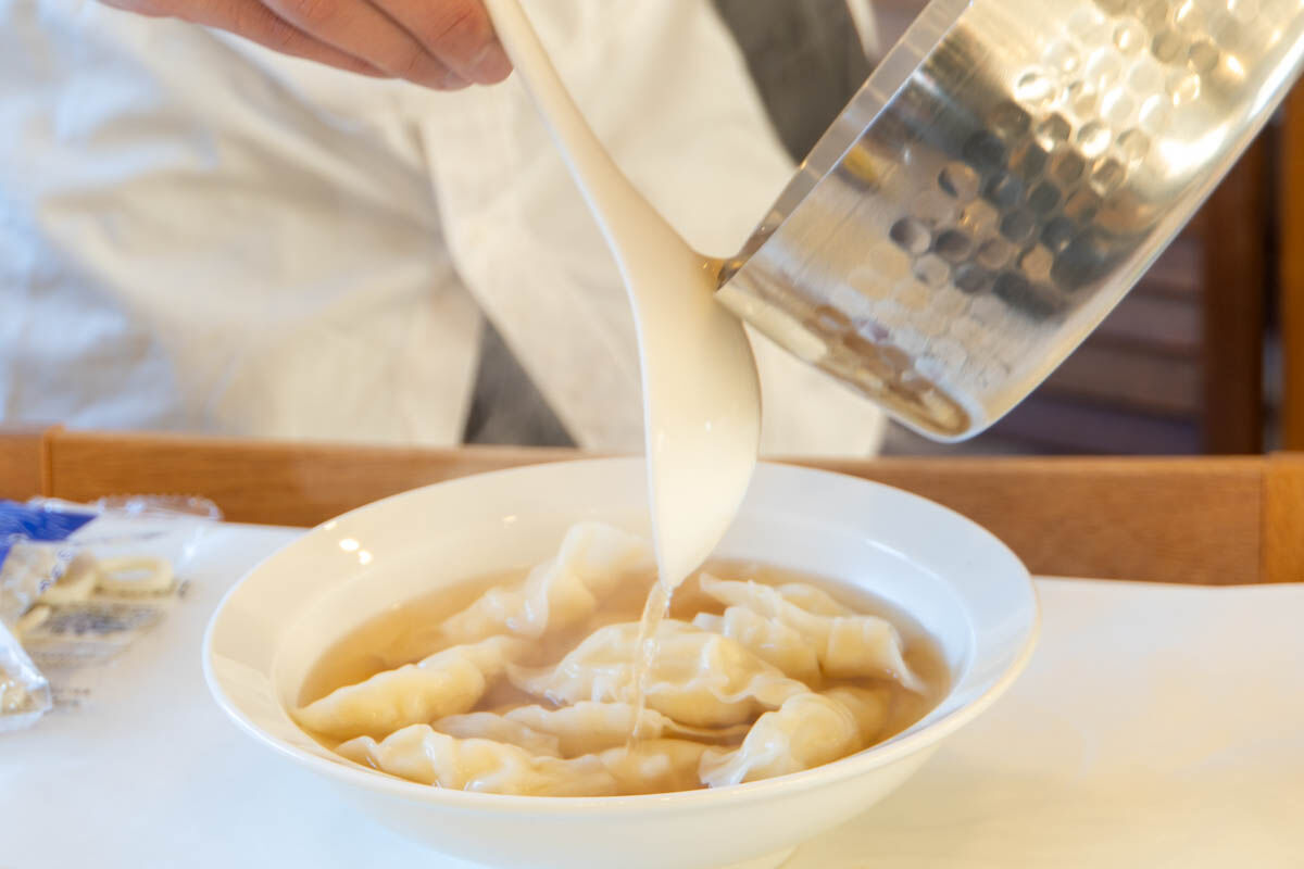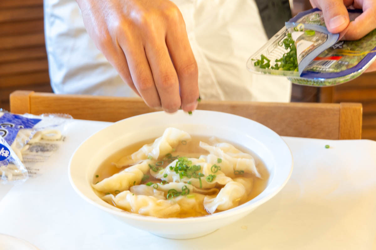 シュンが想像でつくった「うどんギョーザ」は、うどんを餃子の皮で包み、温めた出汁を注いだ料理!