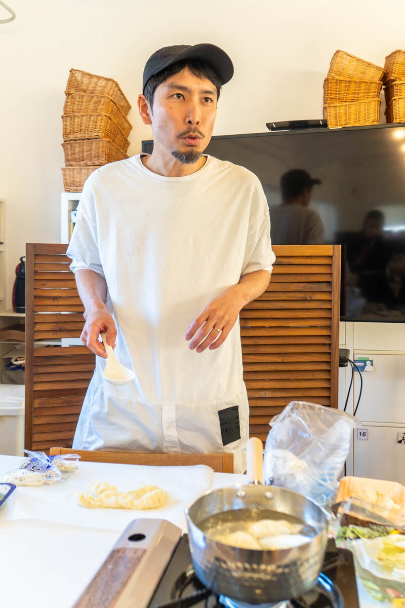 「何って、餃子を茹でるに決まってるじゃないですか〜!」と、うどんを餃子の皮でくるんだだけのものを茹で始めたシュン。