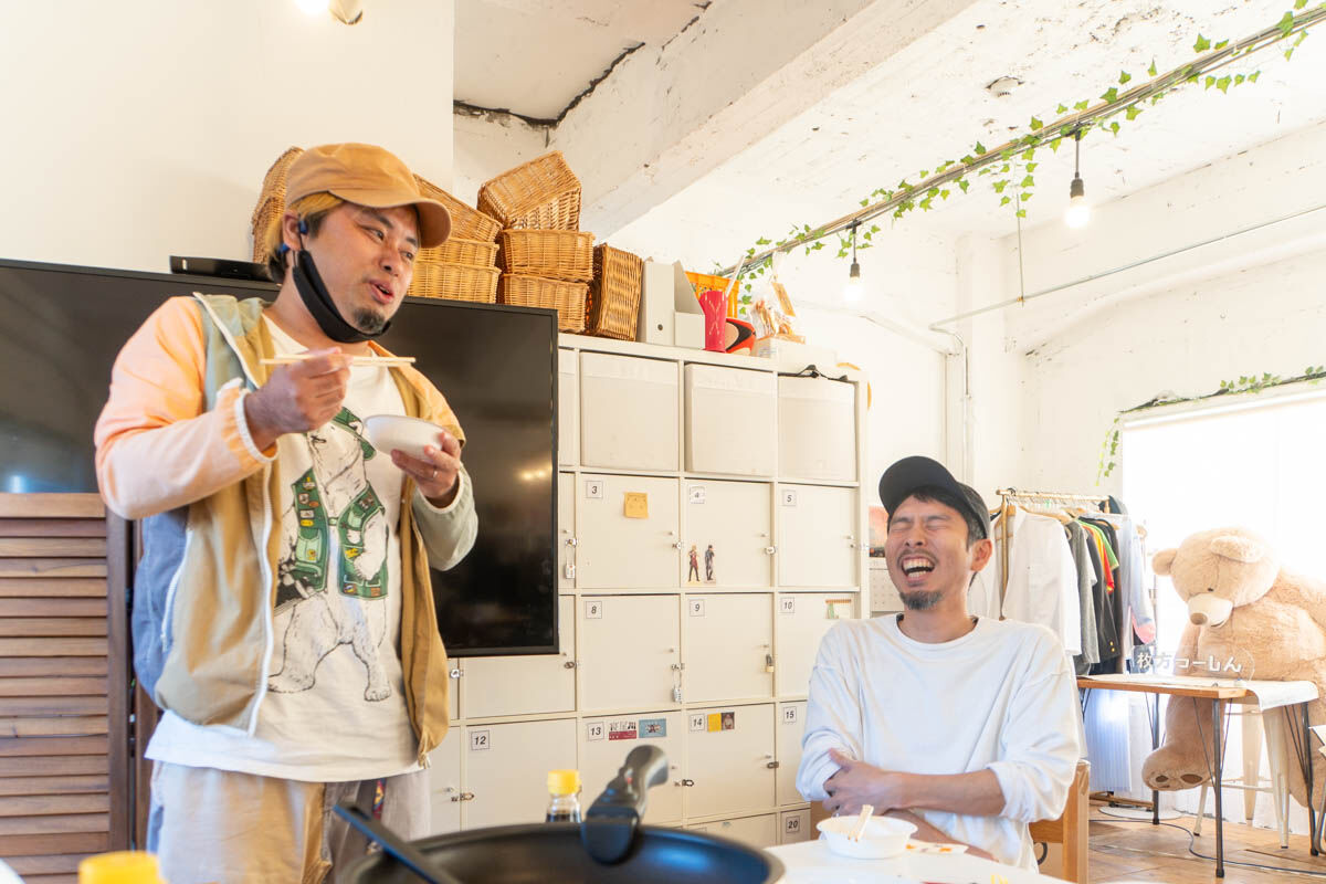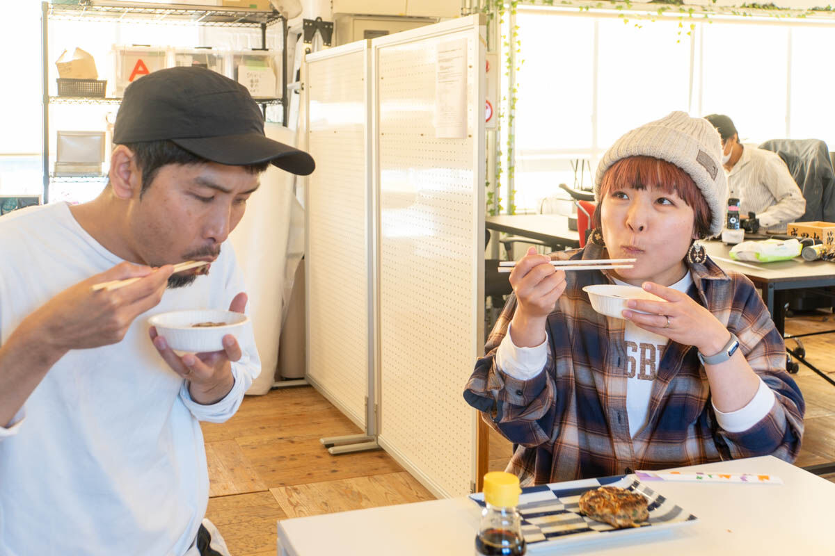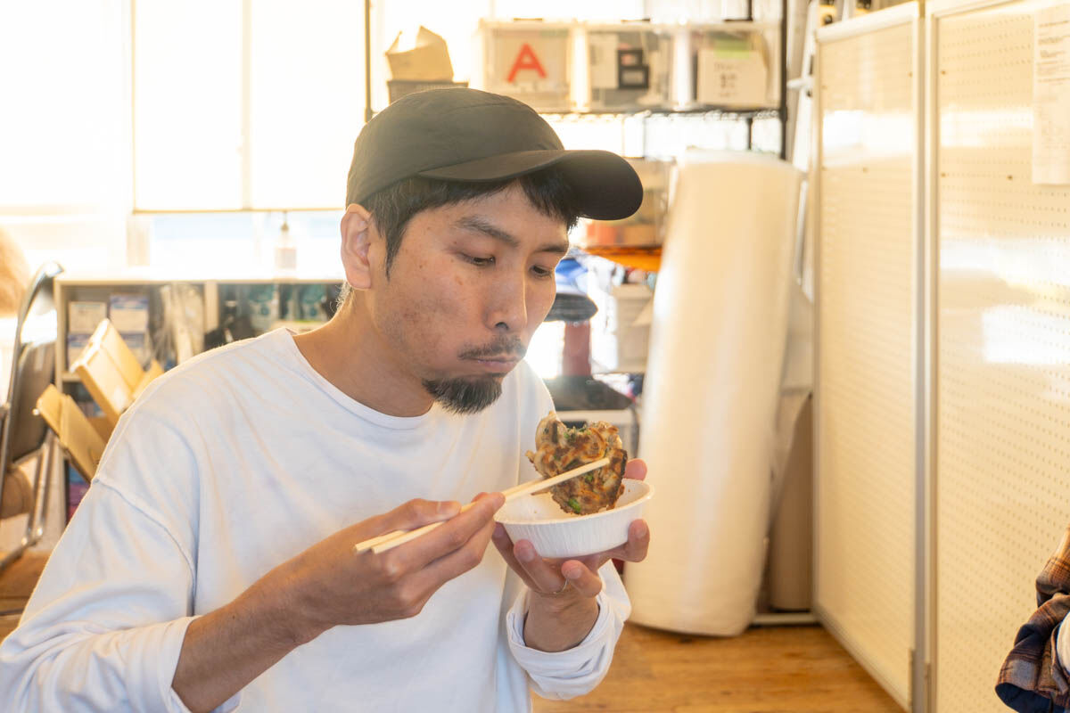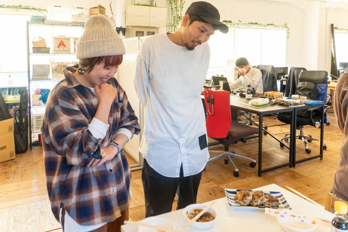 「ちょっと焦げちゃったけど完成!!」いい匂いにつられて事務所メンバーもぞくぞくとやってきて、試食タイム!