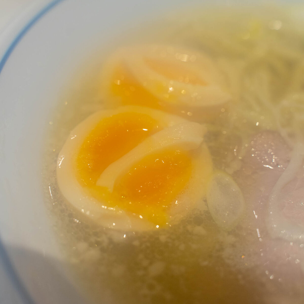 味玉を手動で分割したのがこちらの写真。近寄ったらレンズが曇りました。