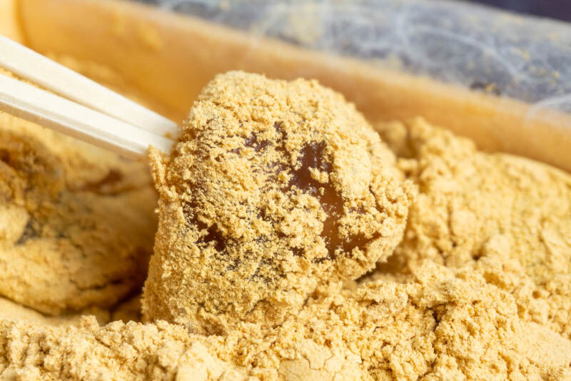 きなこたっぷり♡餅にはあずきが練り込まれています。