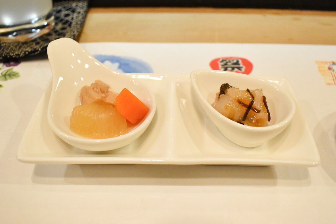 まずは、先付けの鶏とお野菜の煮物とホタテをごま油と昆布で和えたもの。