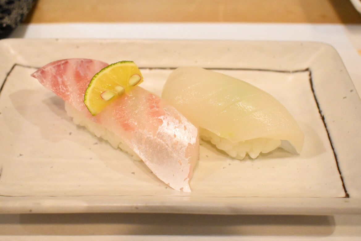 今回は2貫ずつ提供いただき、1皿目は鯛といか。