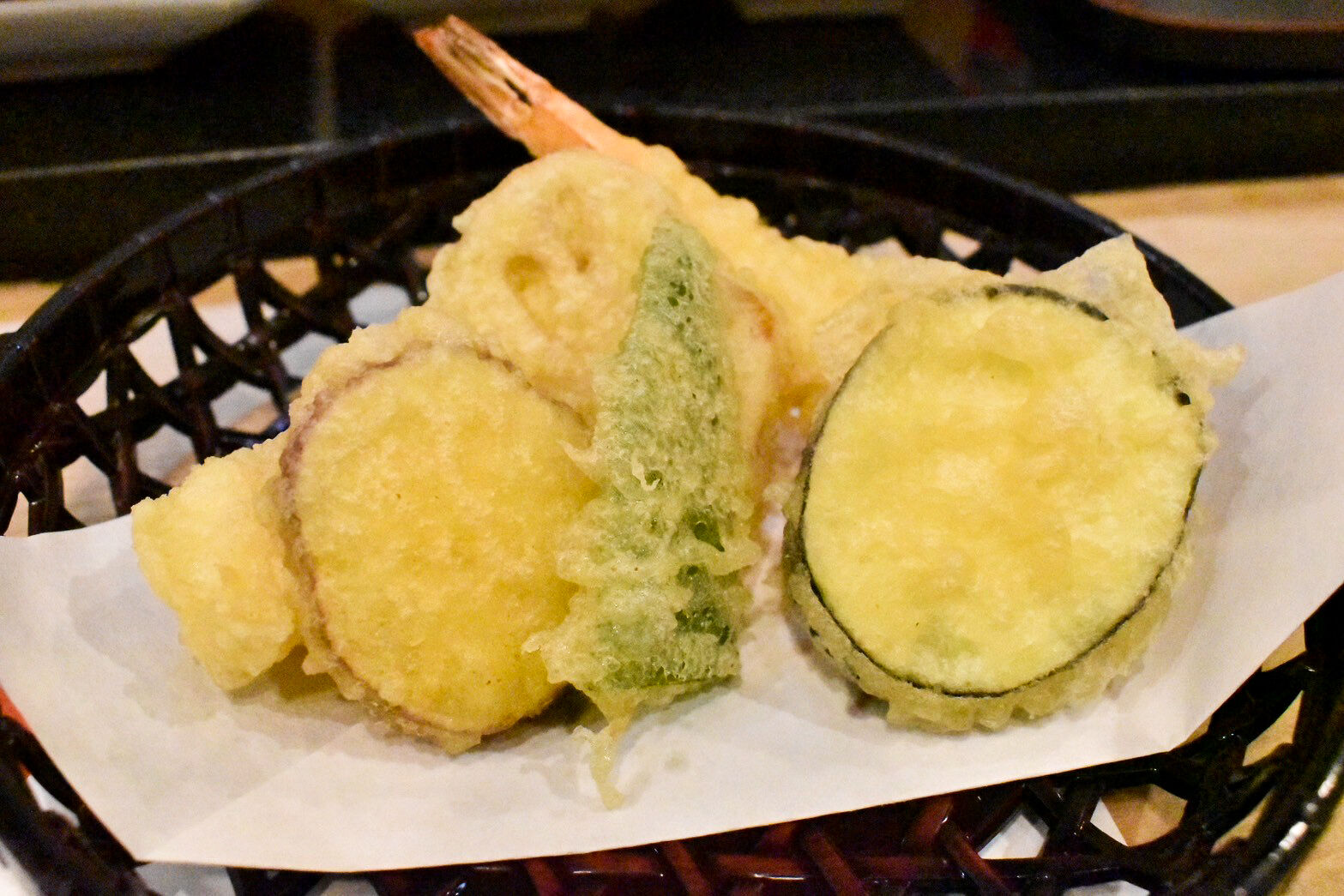 さつまいも、青唐、なす、れんこん、えび2尾とコースの一品にしては豪華すぎる内容。
