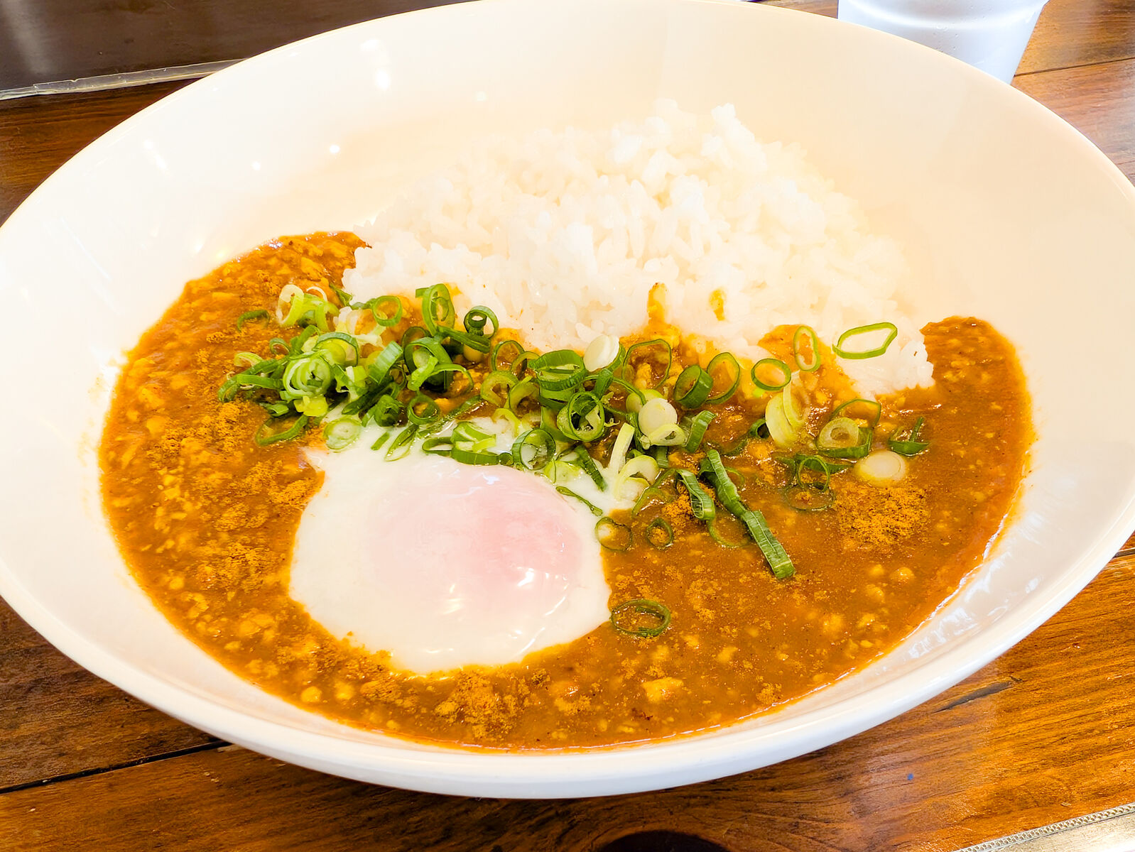 国産鶏ひき肉を使ったカレーに温玉と青ネギが乗った、見た目からしてめちゃくちゃ食欲をそそる一品です。いただきます〜!