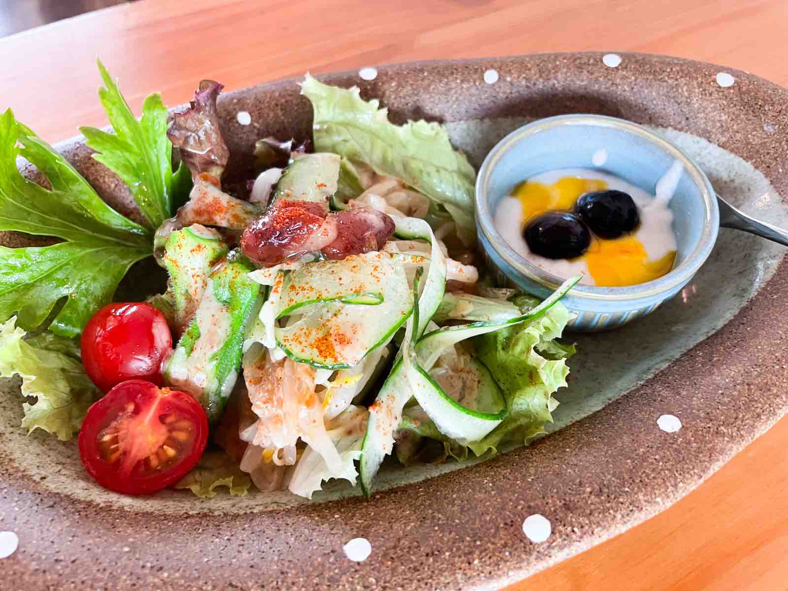 ごまダレドレッシングが掛かっており、冷やし中華を彷彿とさせる味わいでした。