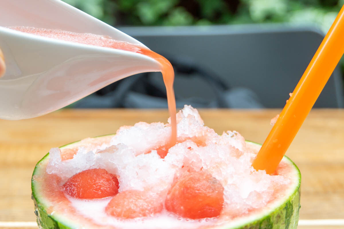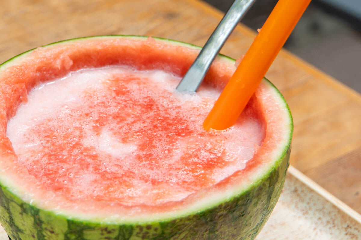 半分ほど食べすすめたので、スイカジュースを投入!