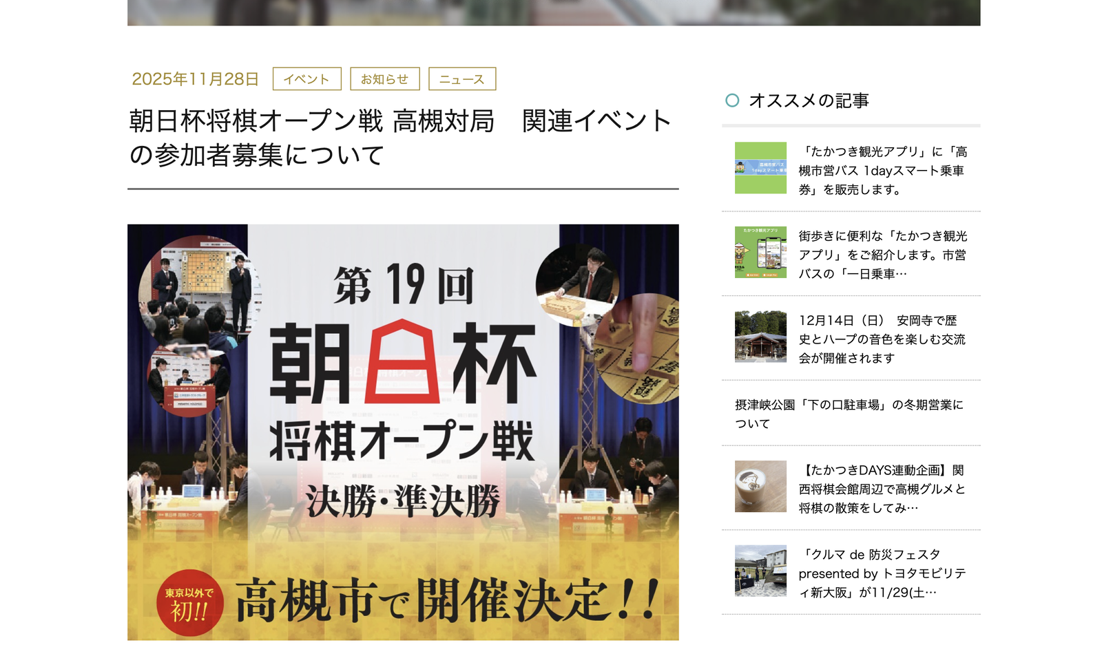 「朝日杯将棋オープン戦 高槻対局」の関連イベント参加者の募集始まるみたい