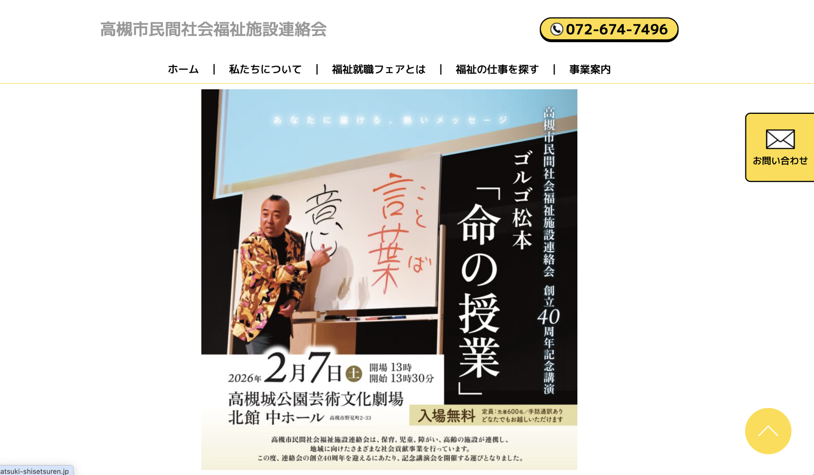 お知らせによると、高槻市民間社会福祉施設連絡会の創立40周年記念式典・記念講演会が2月7日(土)に開催されます。会場は高槻城公園芸術文化劇場 北館・中ホール。