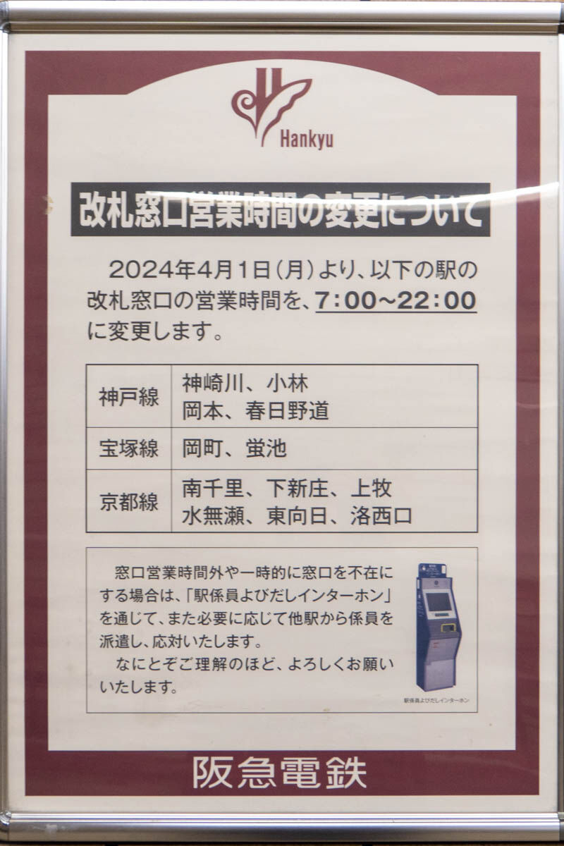 阪急上牧駅ほか一部駅で改札窓口の営業時間が短縮されるみたい。4月1日〜