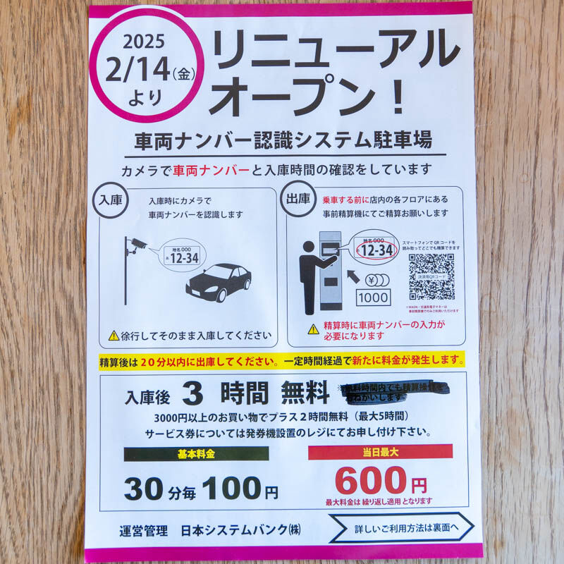 その後は基本30分毎100円で当日最大は600円だそう。お買い物をすると最大5時間無料にもなるそうなので、気になる方はチェックしてみては。