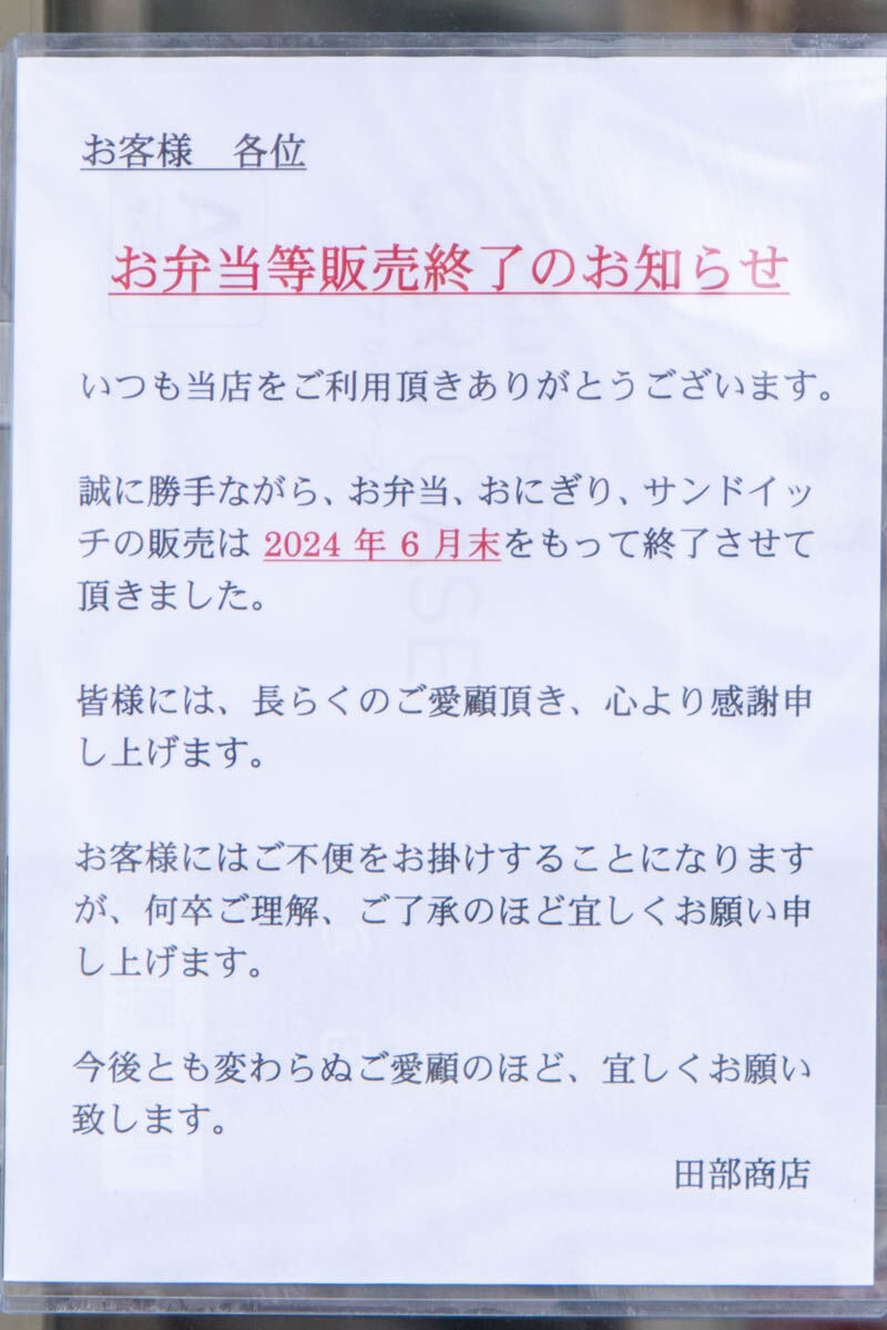 田部商店がお弁当の販売を終了しています。