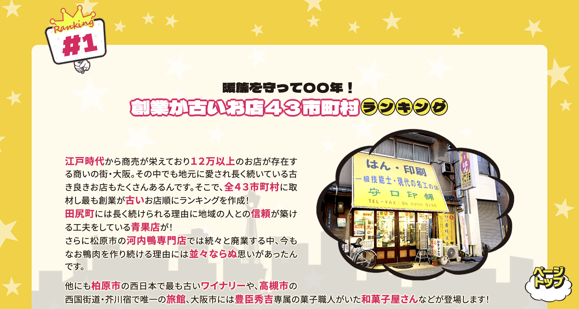 番組公式サイトによると、11月22日放送のテレビ大阪「大阪43市町村を大調査!誰も知らんキング」の『創業が古いお店43市町村ランキング 』で高槻が登場する模様。