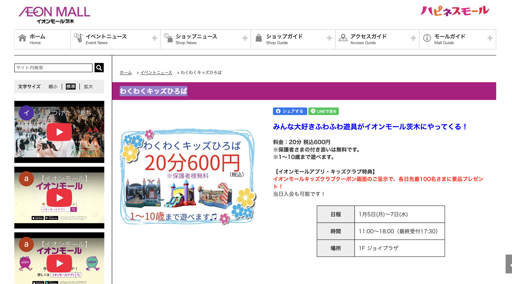 お知らせによると、イオンモール茨木1Fジョイプラザで「わくわくキッズひろば」が1月5日から1月7日の3日間開催されます。開催時間は11時〜18時(最終受付17時30分)。