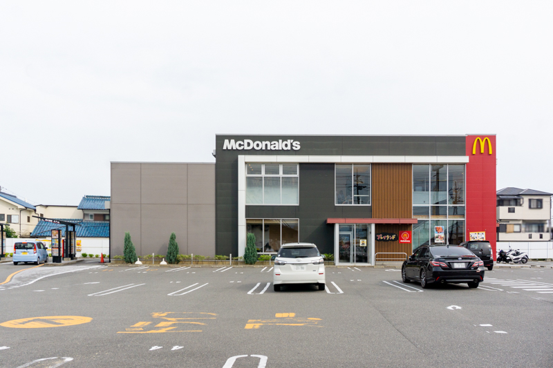 府道132号線沿いにあるマクドナルド。土休日はドライブスルーが24時間利用可能。