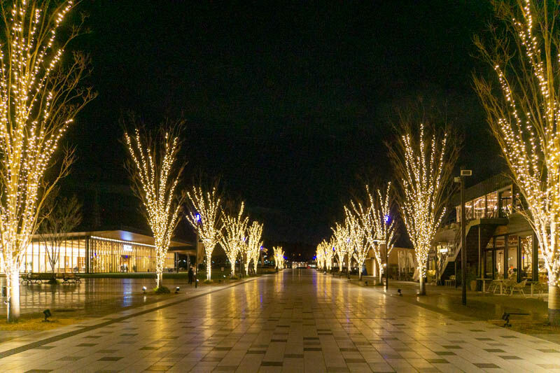 この入口の大きい道は、秋だと紅葉などでも綺麗ですが、冬になると綺麗にライトアップ。